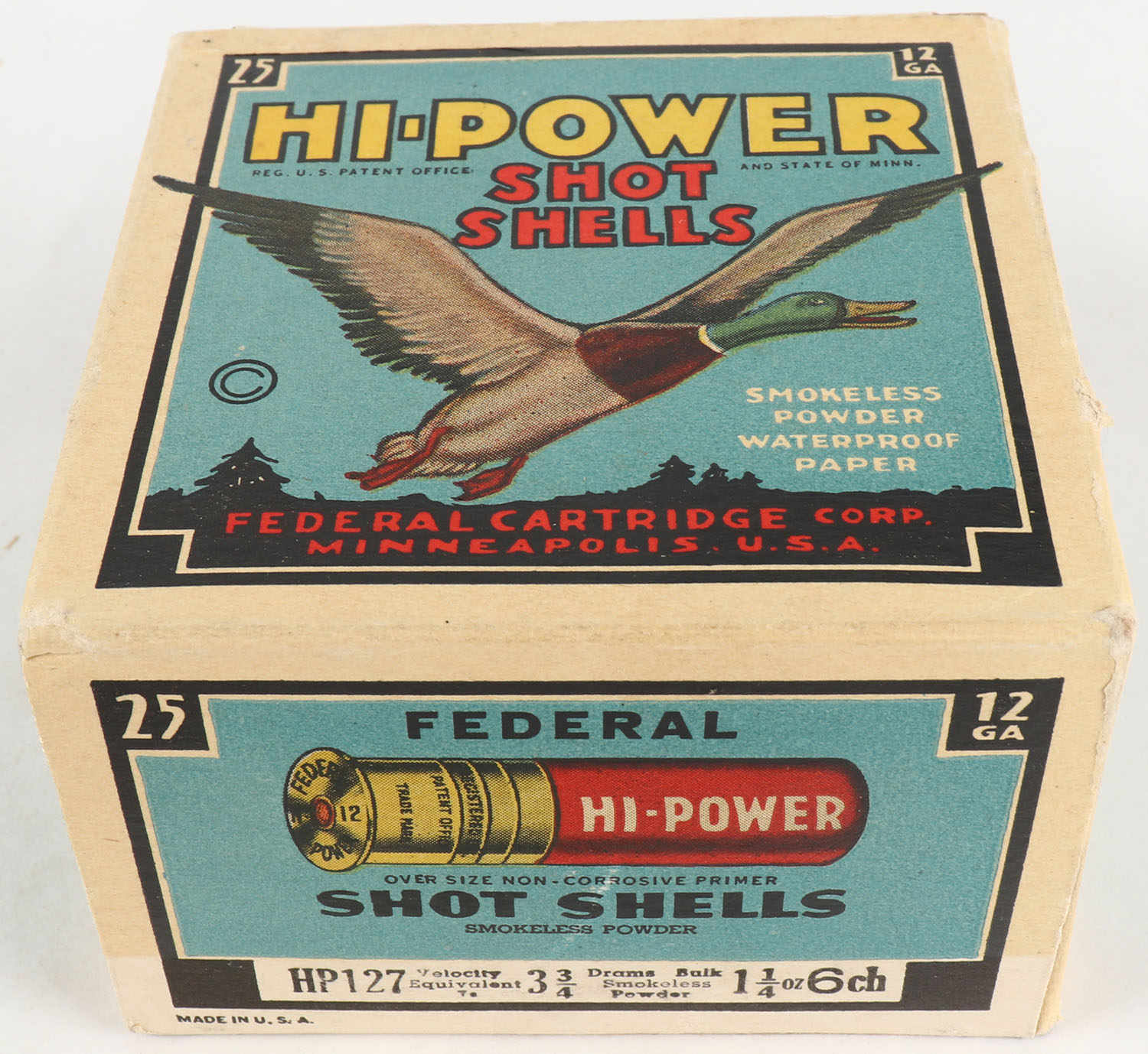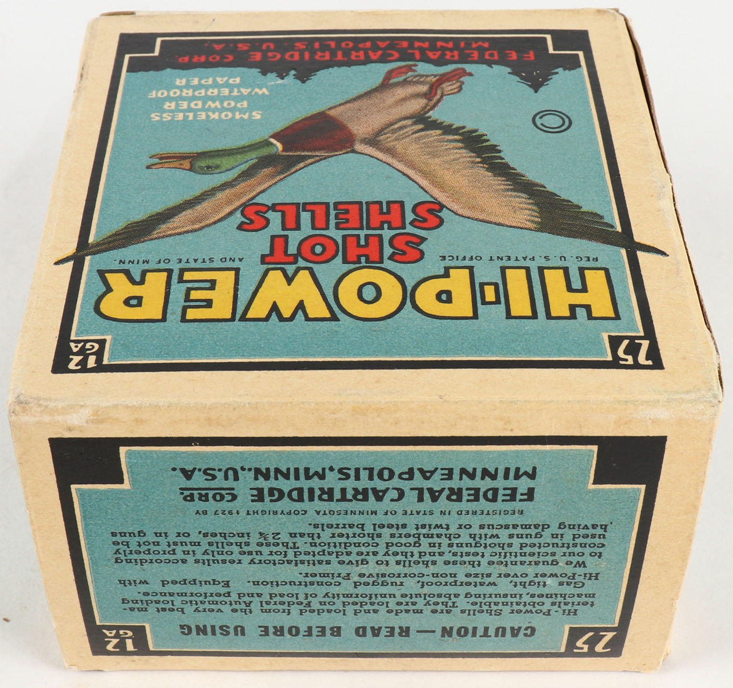 Federal Cart. Co., HI-POWER, 12ga., 1pc., Full, shot size 6CH, Black border, blue, yellow and red box with flying mallard, box is very solid with excellent color, paper shells are excellent. Grade: Excellent ++ - Value: 10 to 40
