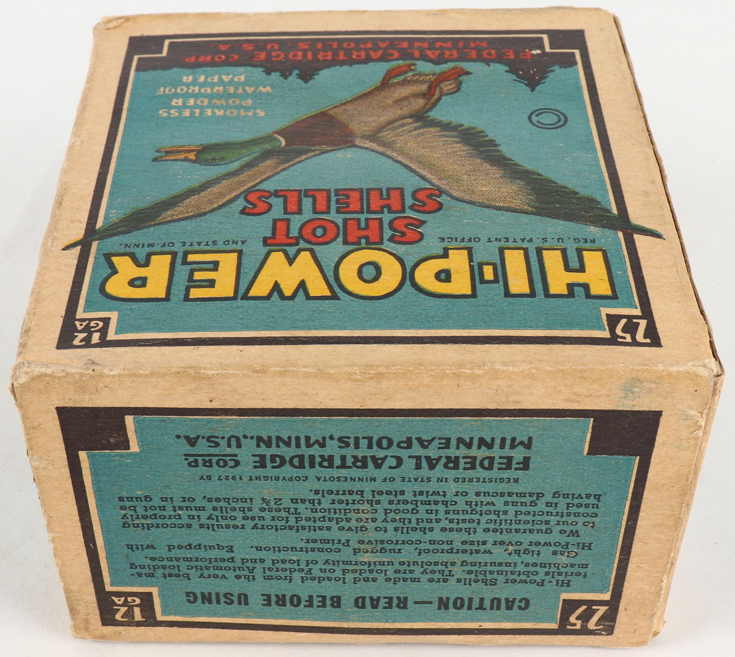 Federal Cart. Co., HI-POWER, 12ga., 1pc., Full, shot size 2, Black border, blue, yellow and red box with flying mallard, box is very solid with some age soiling, box has great colors, paper shells are very good. Grade: Very Good ++ - Value: 10 to 40