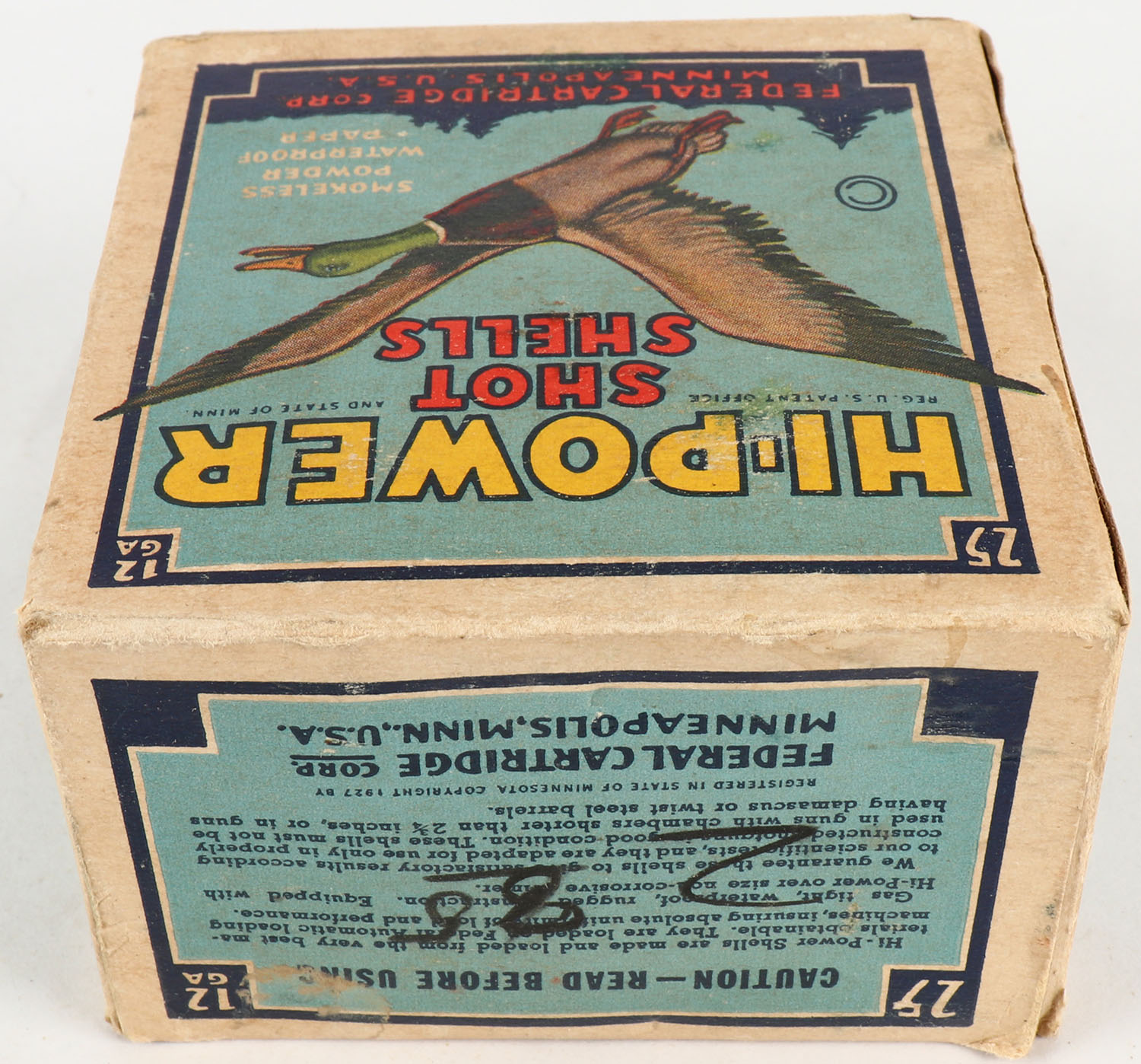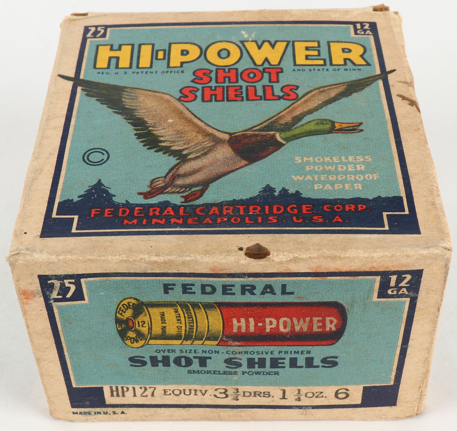 Federal Cart. Co., HI-POWER, 12ga., 1pc., Full, shot size 6, Blue border, blue, yellow and red box with flying mallard, box has age soiling with great colors, paper shells are very good. Grade: Very Good - Value: 10 to 40