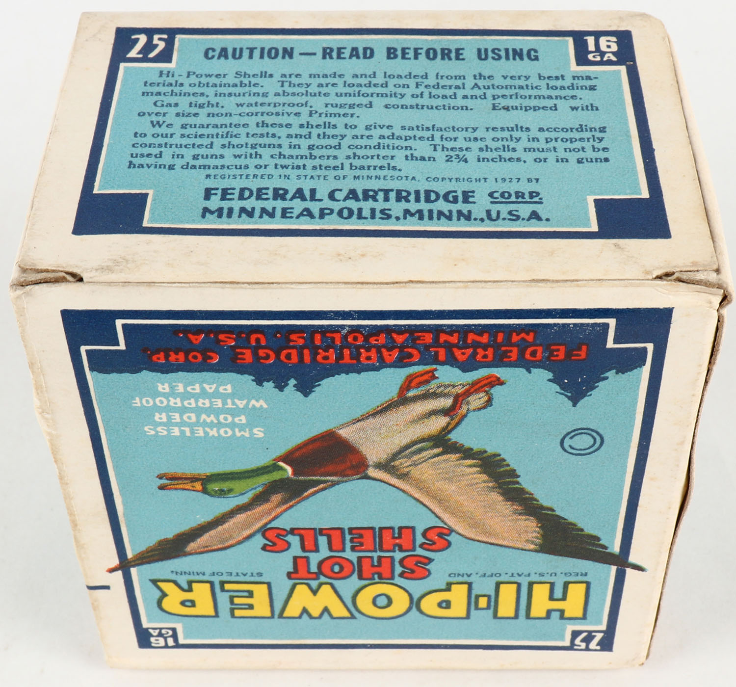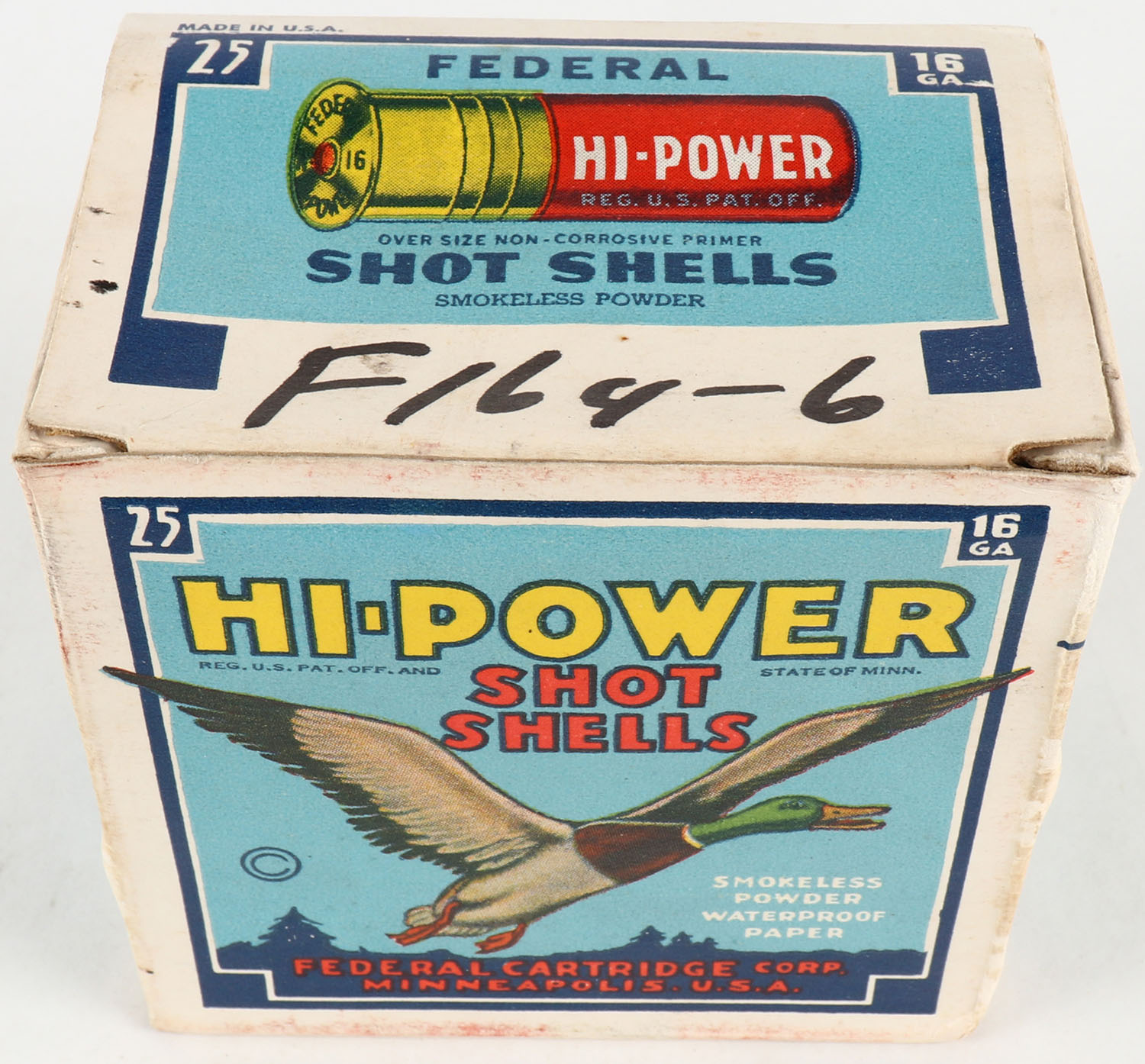 Federal Cart. Co., HI-POWER, 16ga., 1pc., Empty, shot size 6, Blue border, blue, yellow and red box with flying mallard, box is very solid with very nice colors. Grade: Very Good ++ - Value: 10 to 40