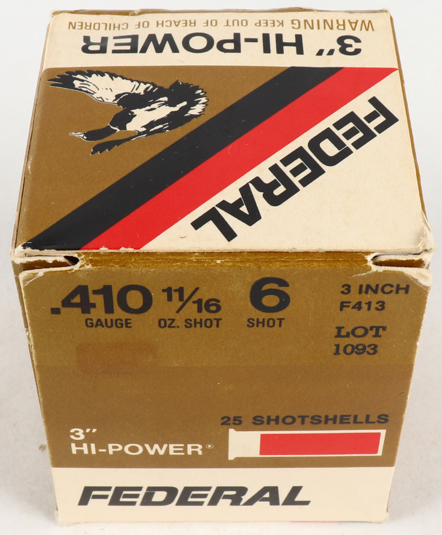 Federal, Hi-Power, 410ga., 1pc., Full, 3'', shot size 6, box is solid with great colors, plastic shells are excellent. Grade: Excellent - Value: 10 to 40