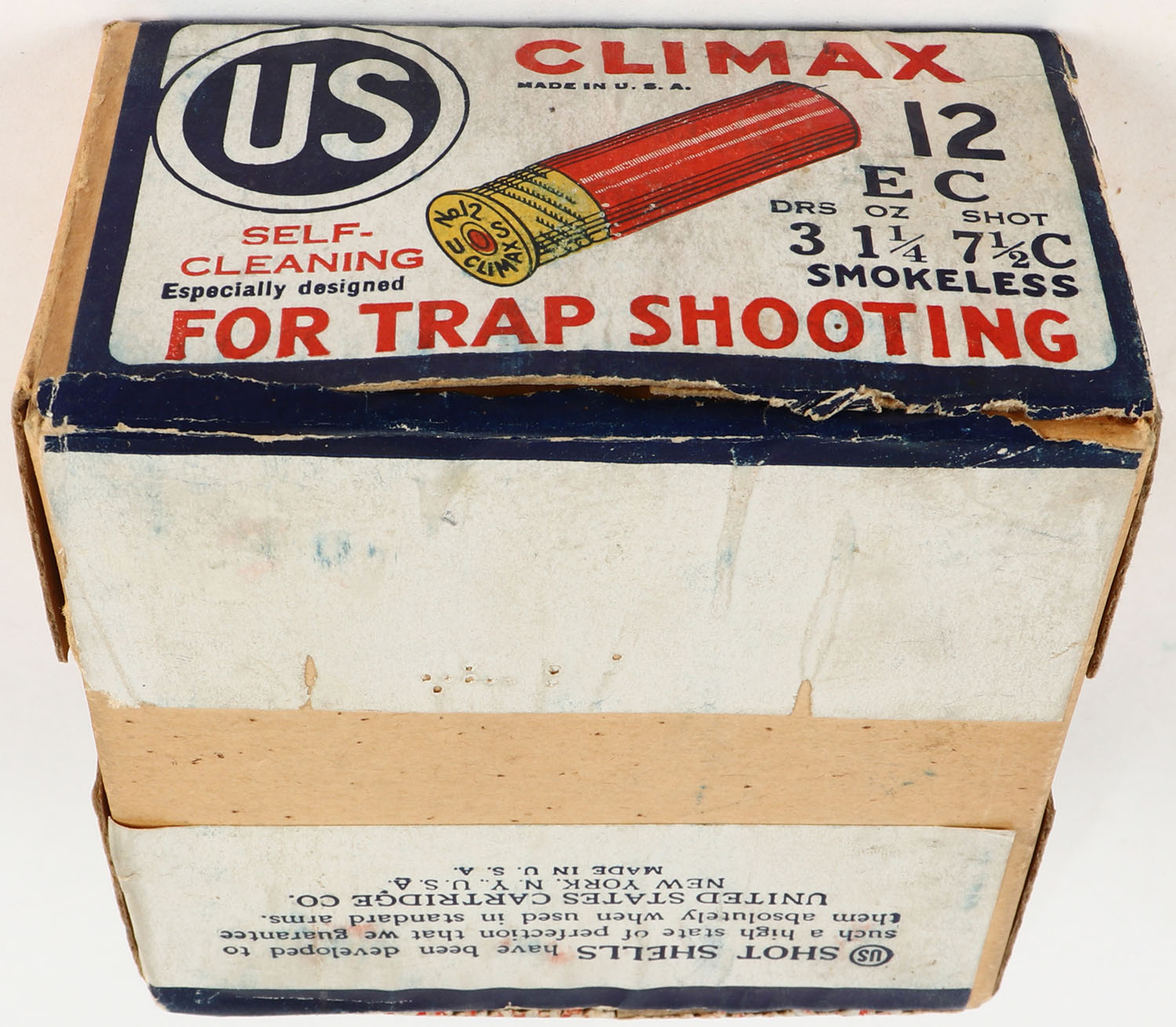 U.S. Cart. Co., New York, NY, CLIMAX, FOR TRAP SHOOTING, 12ga., 2pc., 3'', Empty, shot size 7 1/2C, buff box with white, red & blue paper label, box is very solid with excellent label, has light scuffing with light edge wear. Grade: Excellent + - Value: 20 to 100