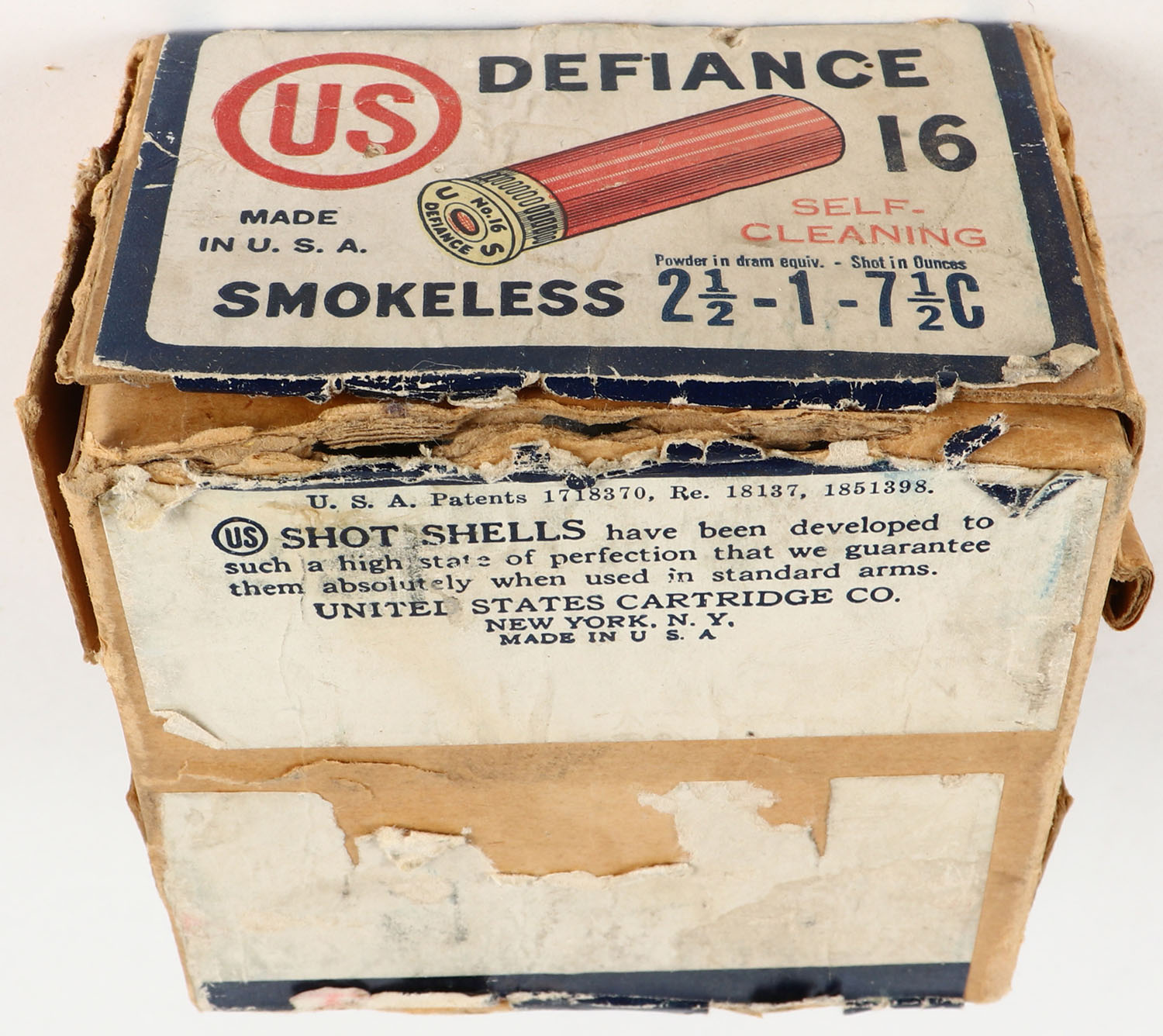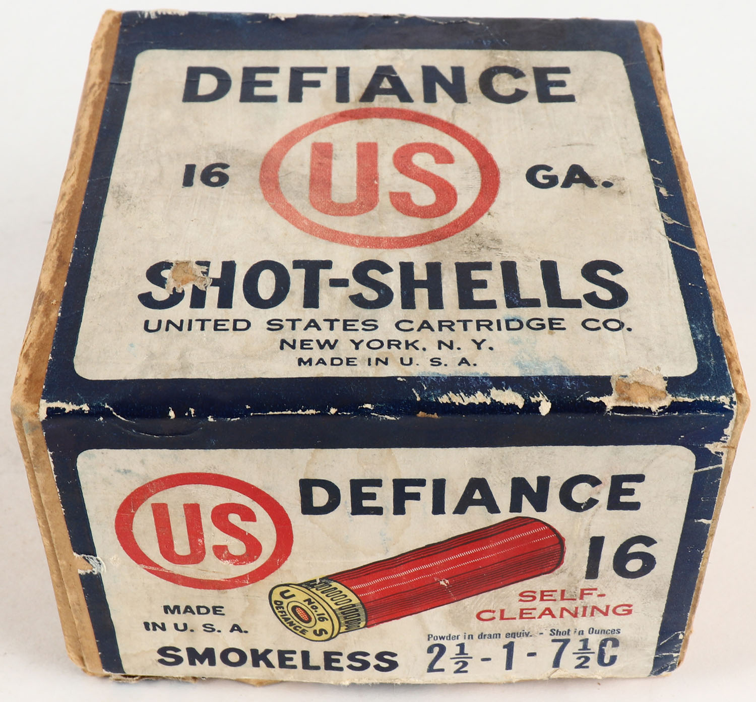 U.S. Cart. Co., New York, NY, DEFIANCE, 16ga., 2pc., 2 1/2'', Partial 5rds., shot size 7 1/2C, buff box with white, red & blue label, box has soiling & scuffing with edge wear, paper shells are very good. Grade: Good ++ - Value: 20 to 60