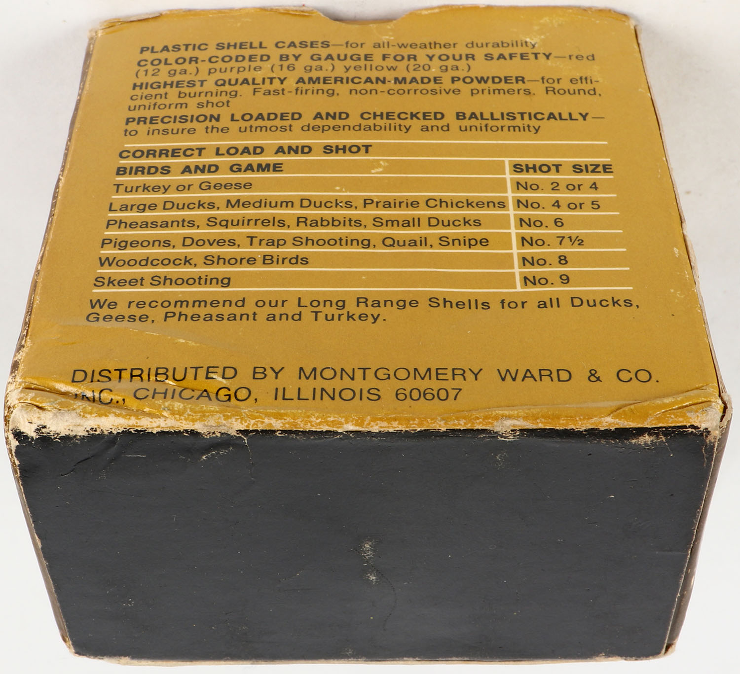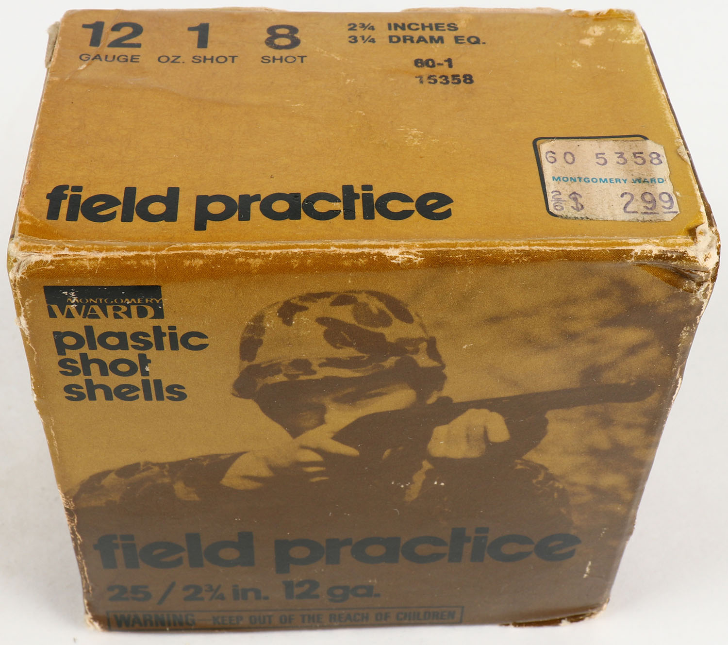 Montgomery Ward, Field Practice, 12ga., 1pc., Partial 24rds., shot size 8, box has edge wear with light scuffing, plastic shells are excellent. Grade: Very Good - Value: 10 to 30