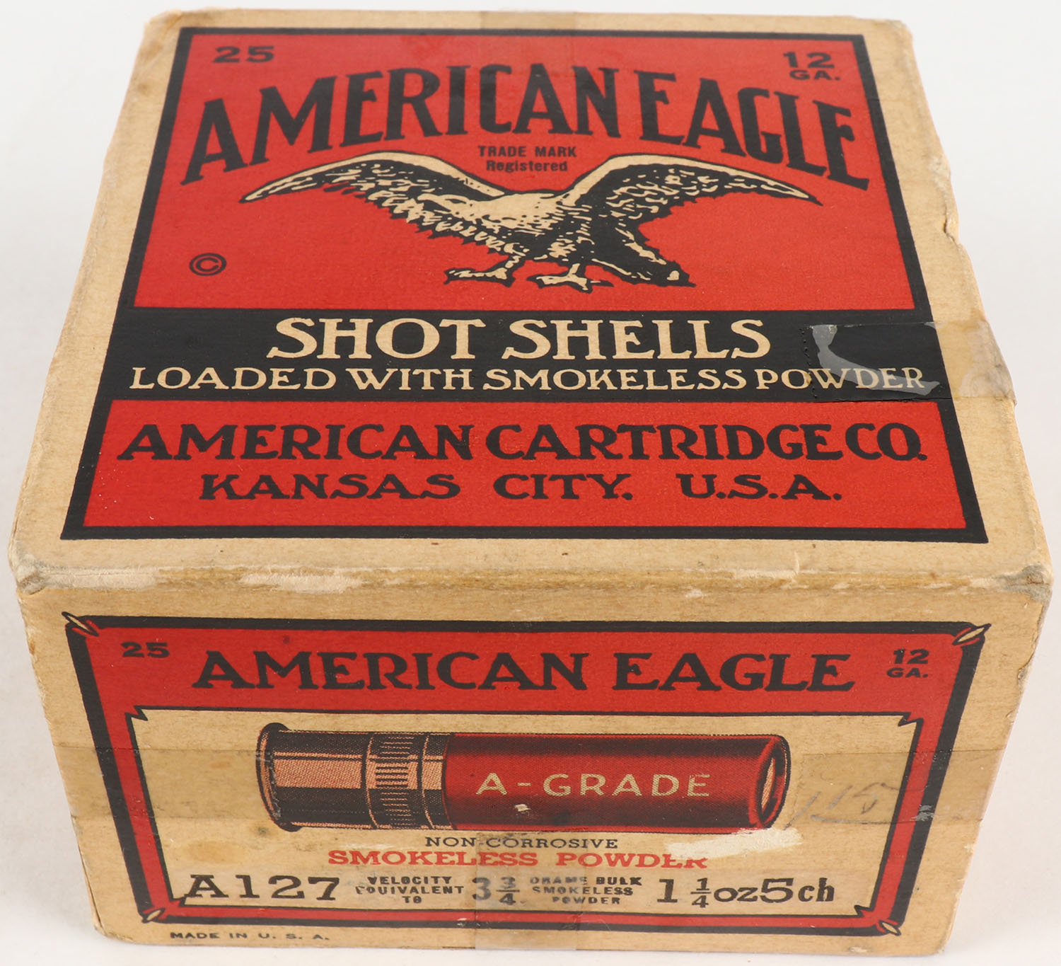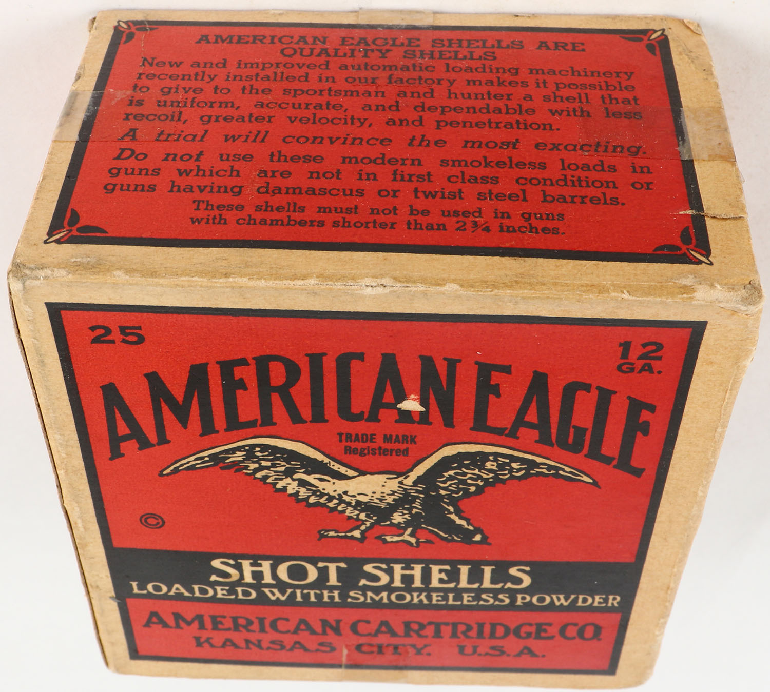 American Cart. Co., A-Grade, 12ga., 1pc., Full, shot size 5ch, buff, red & black box that pictures a flying eagle, box has light edge wear with great colors, paper shells are excellent. Grade: Excellent - Value: 40 to 200