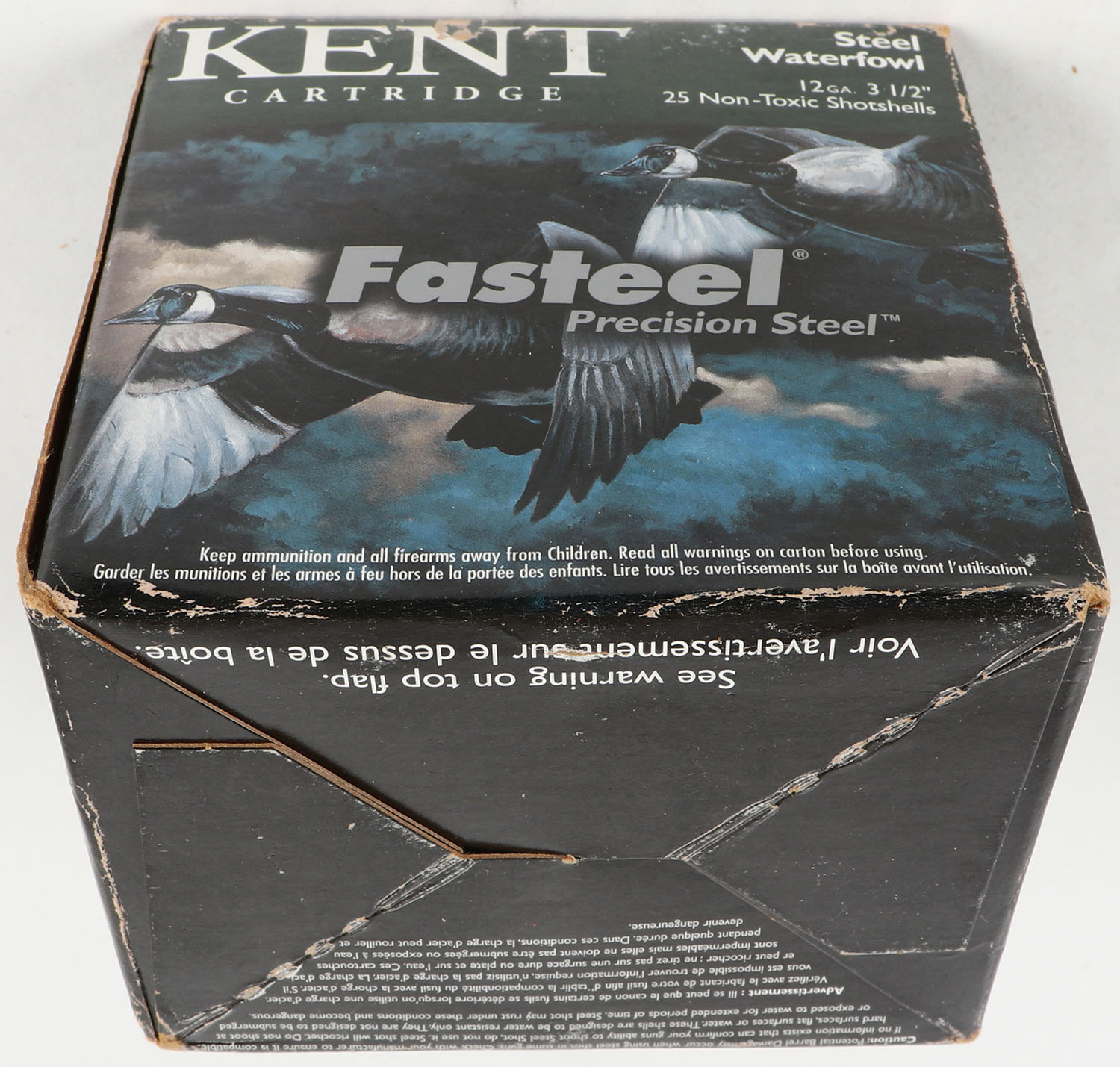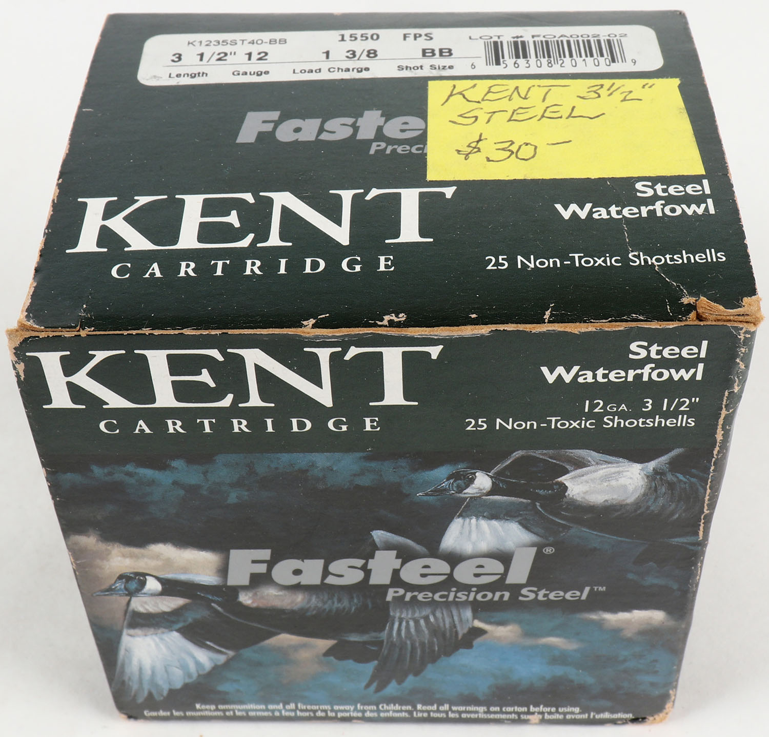 KENT, Steel Waterflow, 12ga., 1pc., Full, shot size BB, 3 1/2'', box is solid with light edge wear, plastic shells are very good. Grade: Very Good ++ - Value: 10 to 40