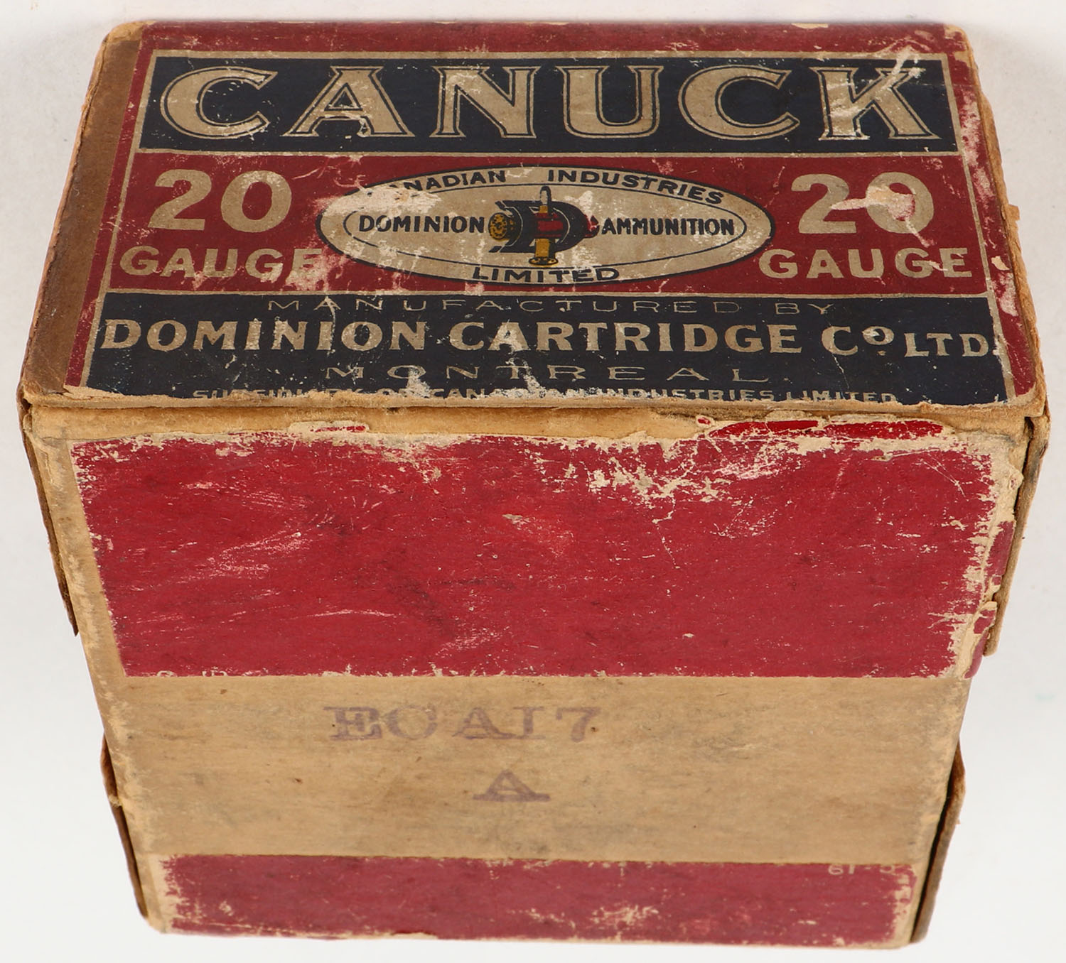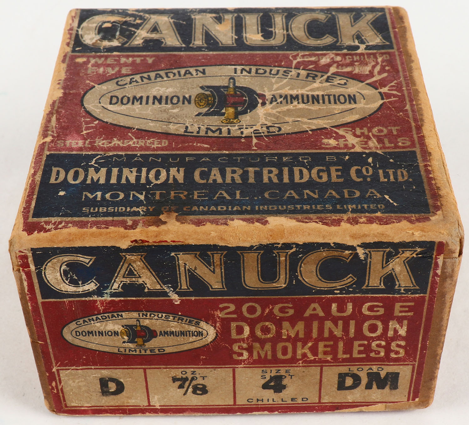 Dominion Cart. Co., Canuck, 20ga., 2pc., Empty, shot size 4CH, red, blue & white box, box has scuffing & soiling with edge wear, HARD TO FIND BOX! Grade: Very Good ++ - Value: 40 to 200