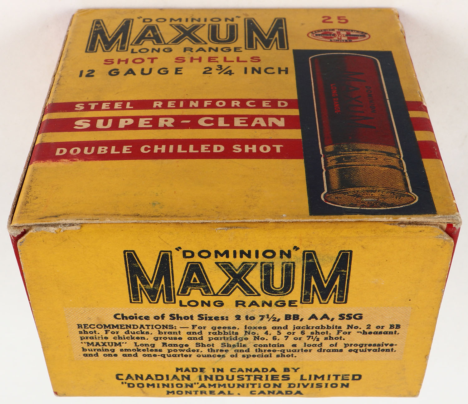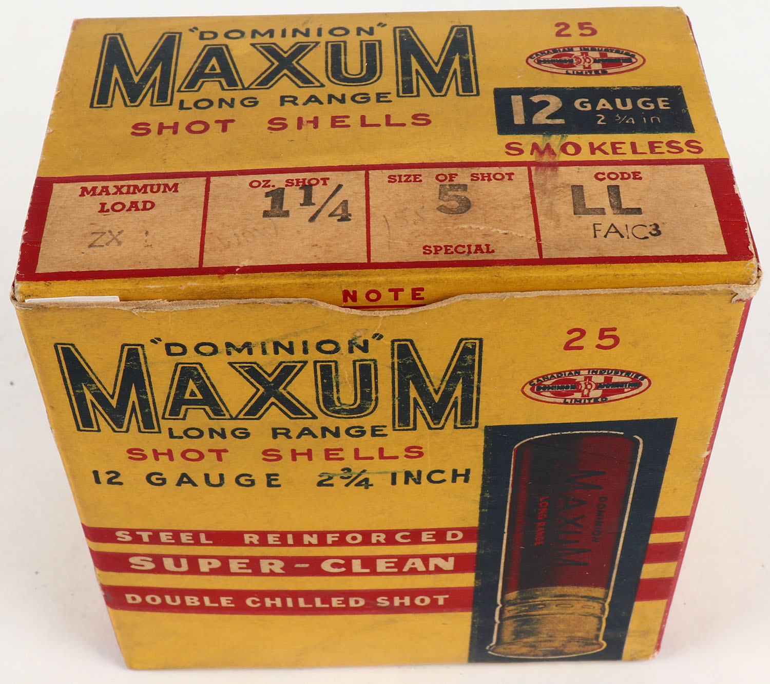 CIL, Maxum, 12ga., 1pc., 2 3/4'', Empty, shot size 5, buff box with great colors, box is very solid with light scuffing. Grade: Very Good ++ - Value: 20 to 100
