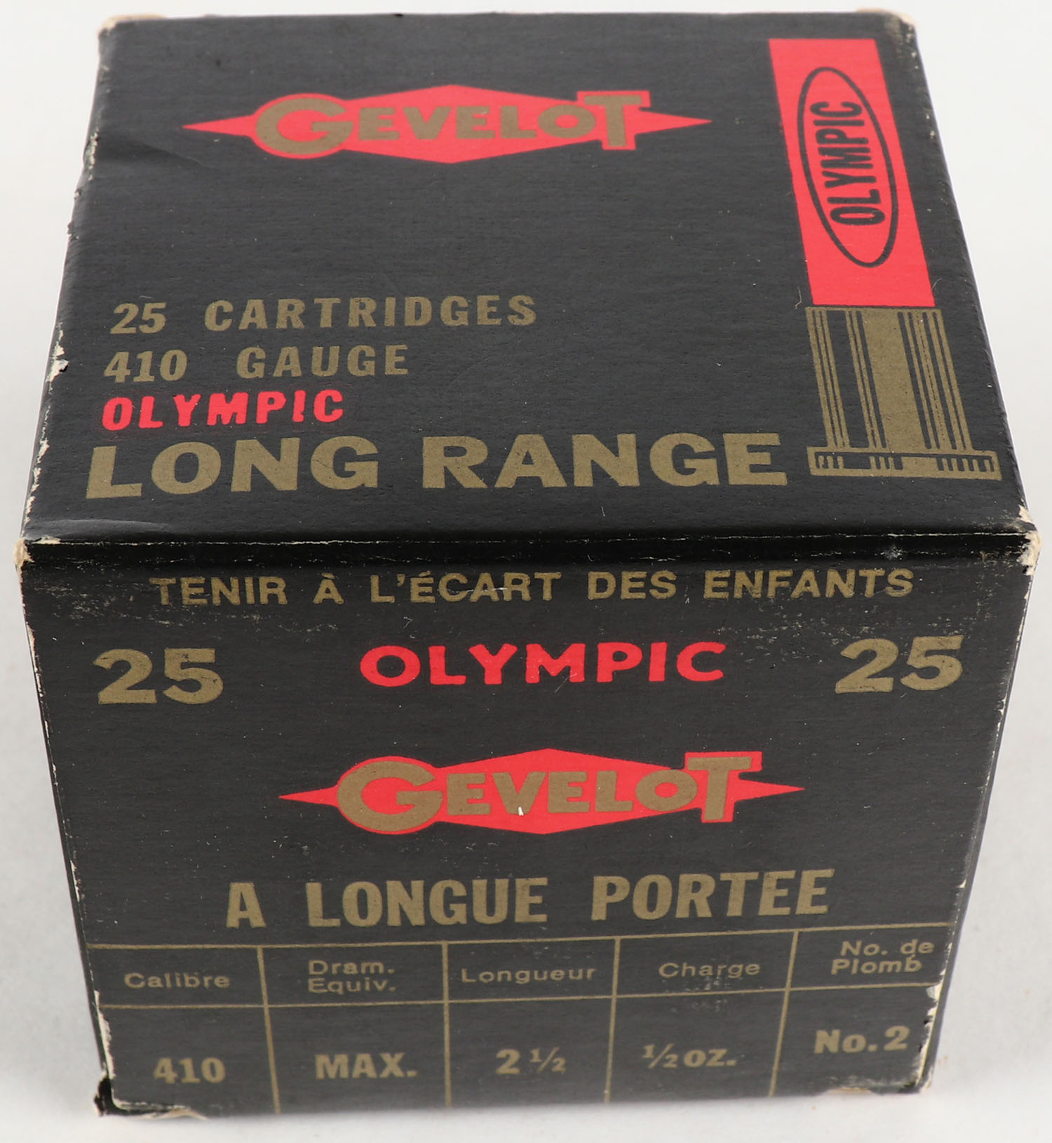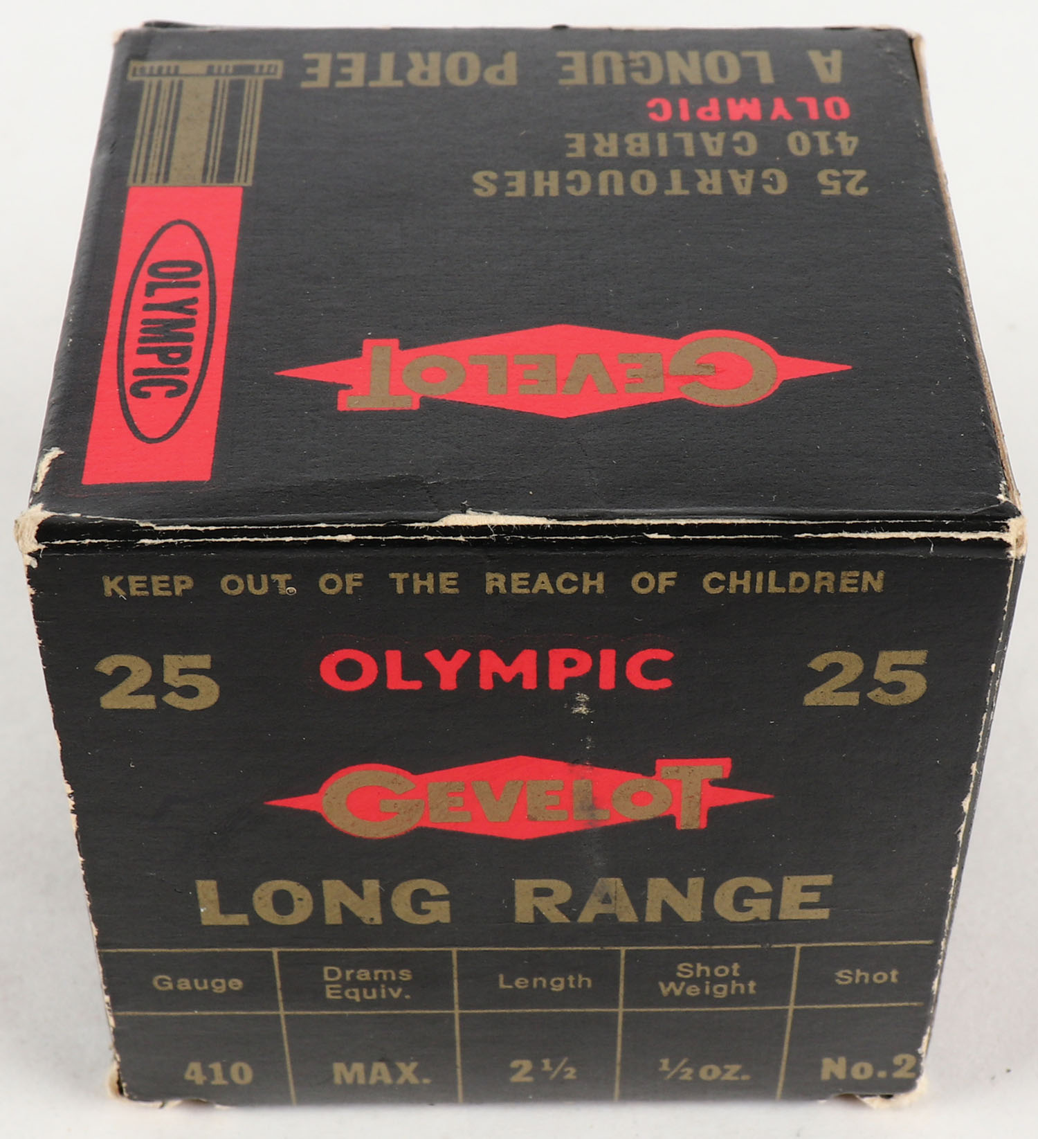 Gevelot, Olympic Long Range, 410ga., 2 1/2'', 1pc., Partial 23rds. Of incorrect shells, shot size 2, box is solid, paper shells are very good. Grade: Very Good - Value: 8 to 150