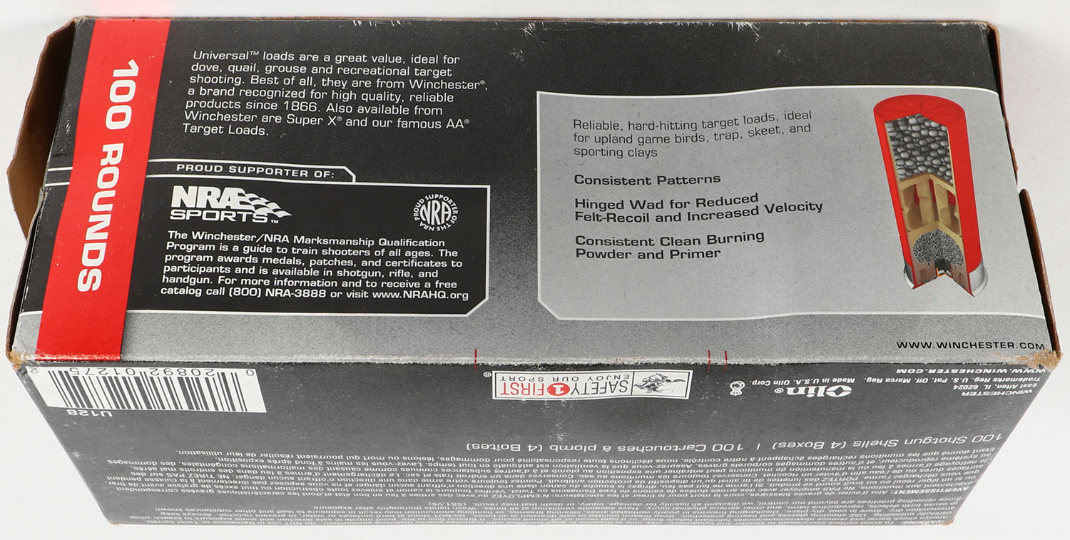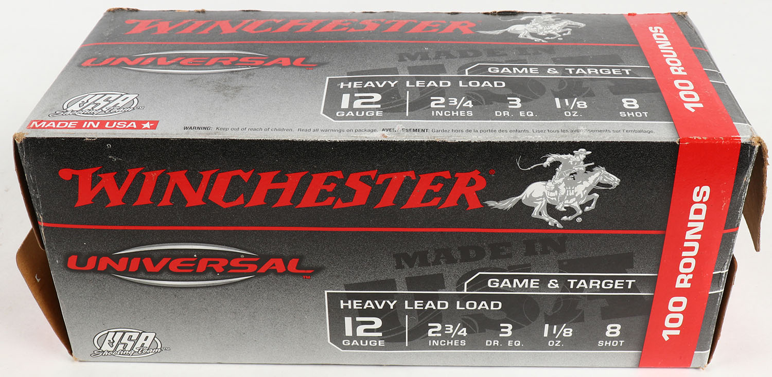FULL CASE of WINCHESTER, Universal, Heavy Lead Load, 12ga., 1pc., 2 3/4'', shot size 8, 100rds., FULL & HALF SEALED, multi-colored case, case is very solid, has four 25 rd. Boxes inside. Grade: Very Good ++ - Value: 50 to 200