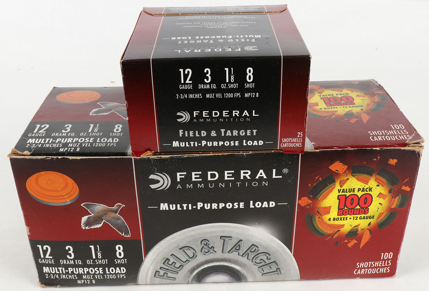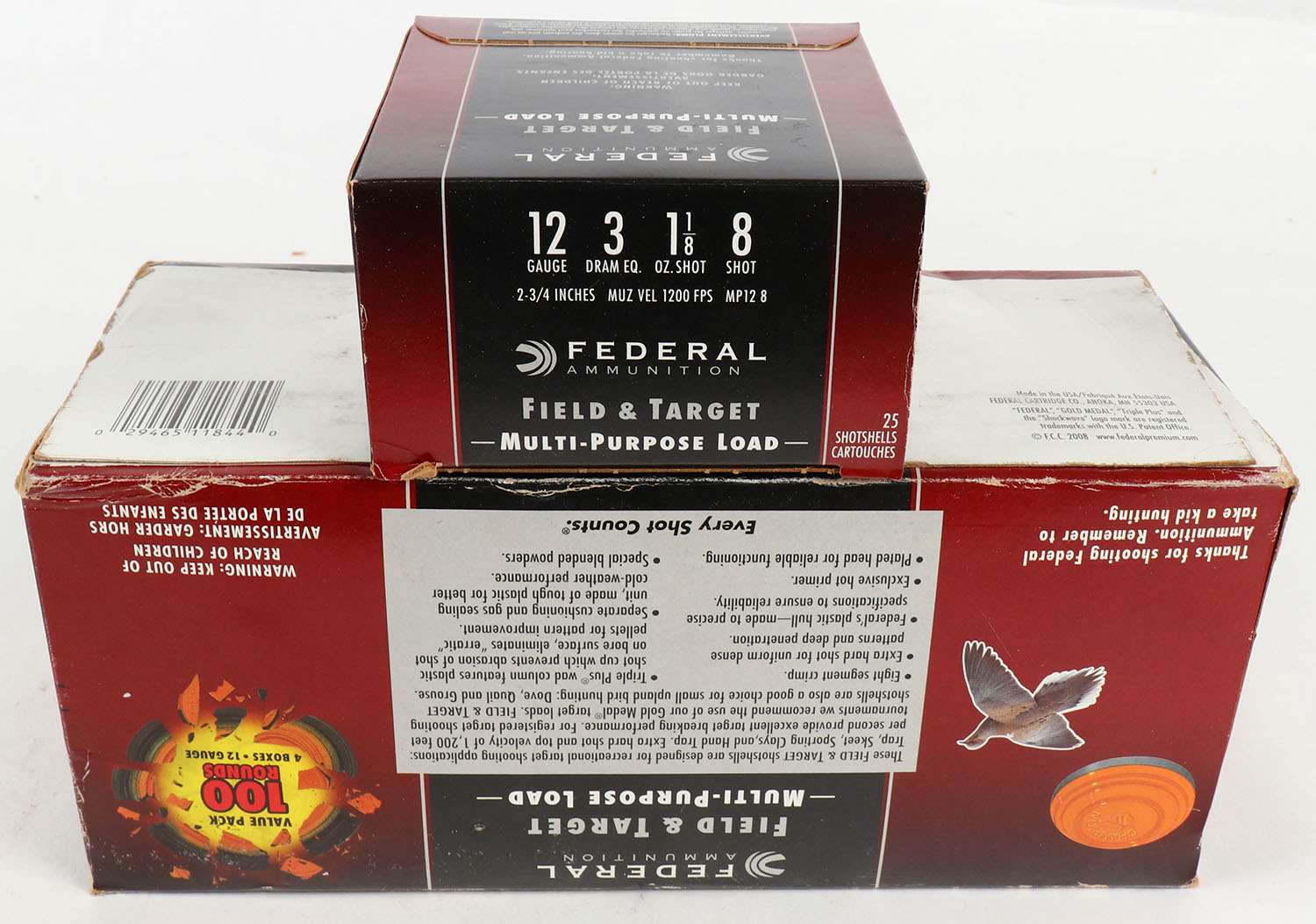 FULL CASE of FEDERAL, Field & Target, 12ga., 1pc., Full, shot size 8, 2 3/4'', Total of 100rds. Grade: Excellent + - Value: 50 to 200