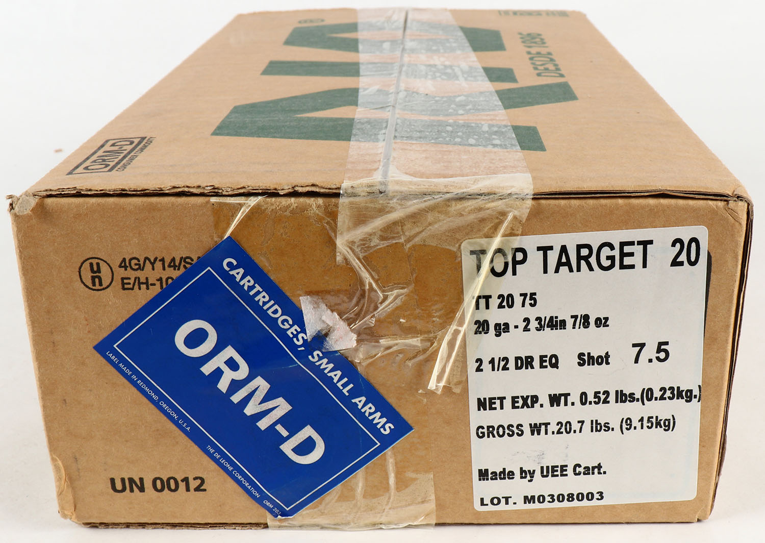 FULL CASE of RIO, Top Target, 20ga., 1pc., FULL & SEALED, 250rds., 2 3/4'', shot size 7 1/2, case is very solid. Grade: Excellent + - Value: 100 to 300