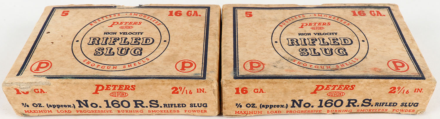 Lot of 2 Peters, 16ga., 1pc., Appears Full, shot size Rifled Slug, multi-colored boxes. Grade: Very Good ++ - Value: 8 to 30