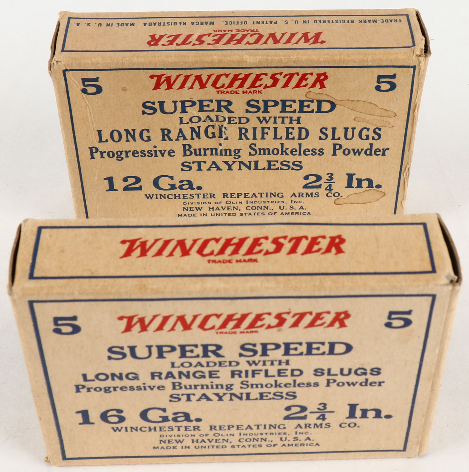 Lot of Winchester, 12 & 16 ga., 1pc., Appears Full, 2 3/4'', shot size Long Range Rifled Slugs, multi-colored boxes. Grade: Very Good - Value: 10 to 30