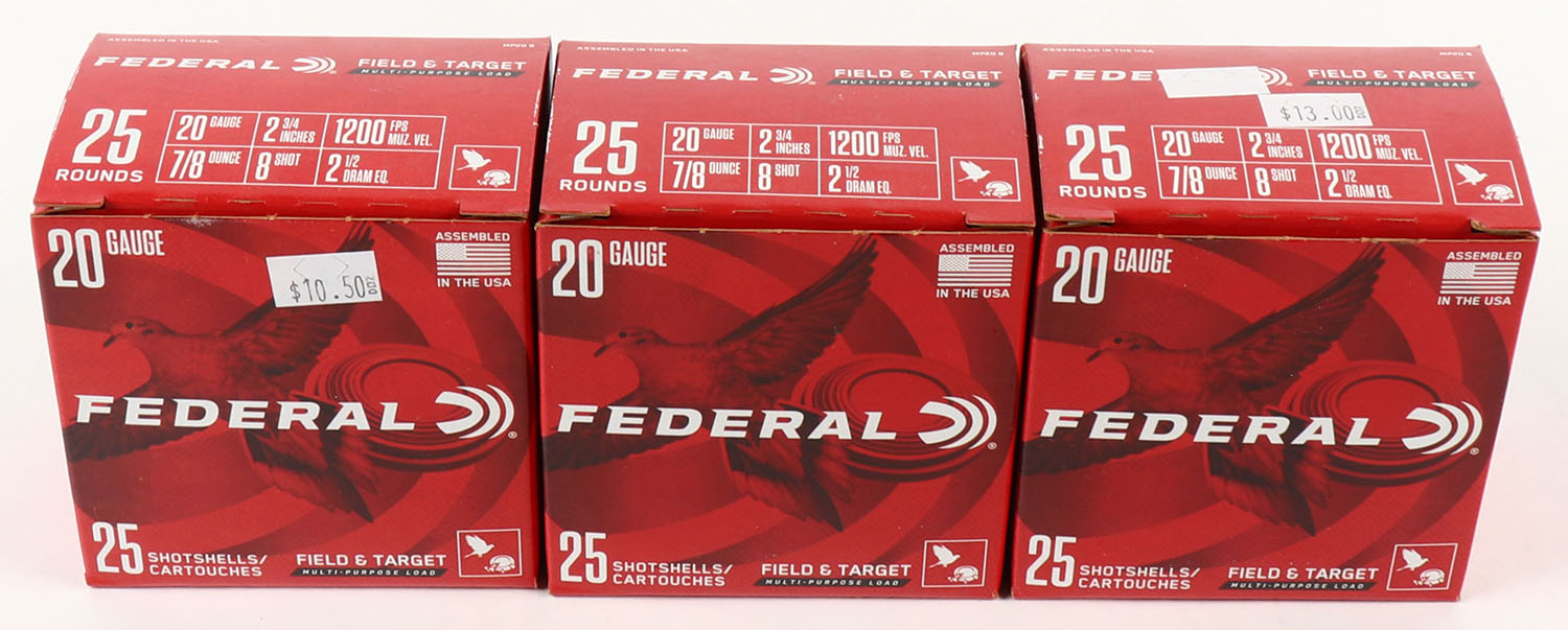 Lot of 3 Federal, 20ga., Appears Full, Shotshell Boxes. Grade: Excellent + - Value: 10 to 40