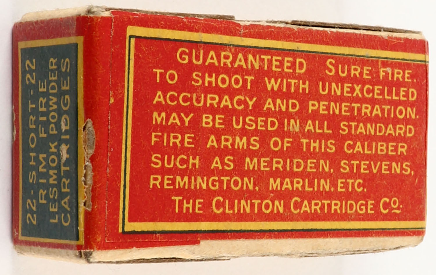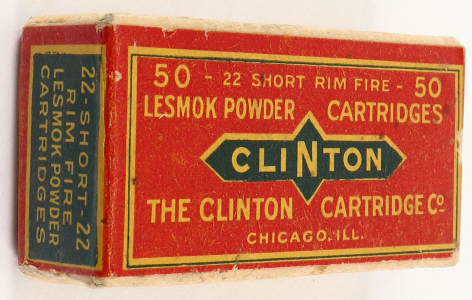 Clinton, Lesmok Powder Cartridges, .22 Short, RHWeb: CLINT-1 S-2b, FULL & SEALED, 2pc. Buff box with red & green wraparound label, box is solid with very good to excellent color, very minor age soiling & shelf wear, very minor corner wear, edges are mostly crisp, label is intact. Grade: Excellent - Value: 60 to 240