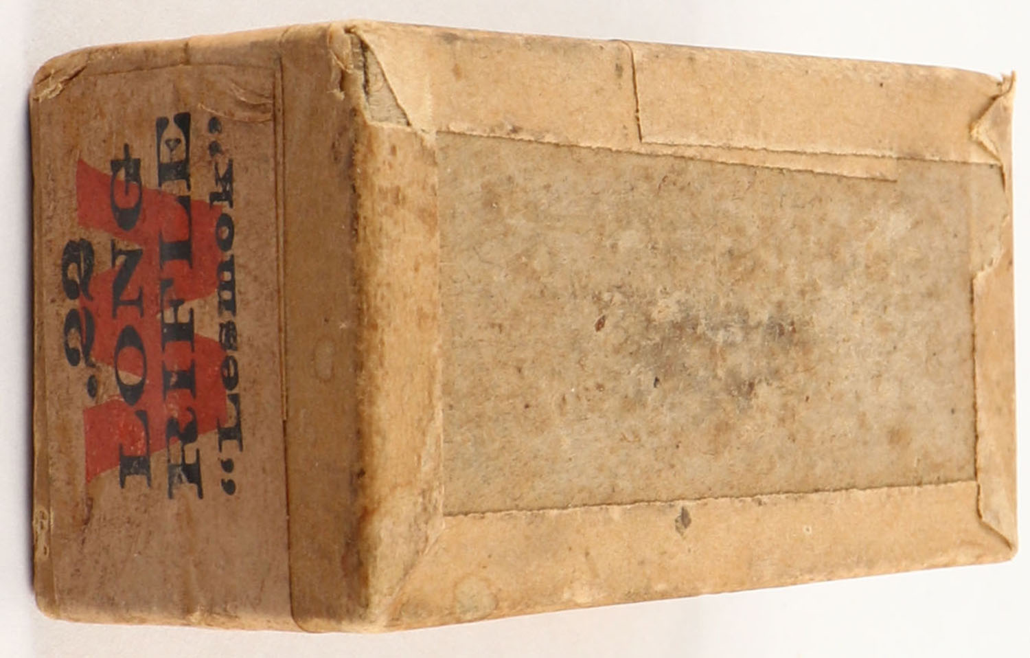 Winchester, ''Lesmok'' Rifle Cartridges, .22 Long Rifle, RR: WRA-121 LR-26c, FULL & SEALED, 2pc. Buff box with green top & off-white side sealing labels, box is solid with good to very good color, some age soiling, minor edge & corner wear, labels are intact. Grade: Very Good ++ - Value: 20 to 80