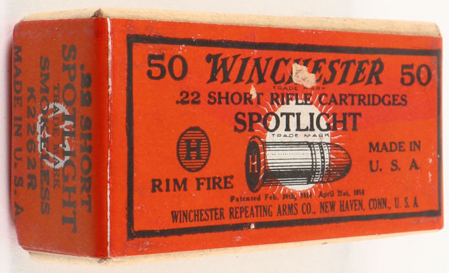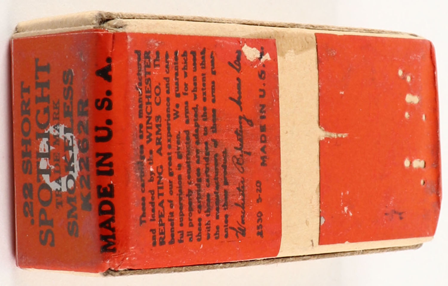 Winchester, Spotlight, .22 Short, RR: WRA-81 SS-8c, FULL & SEALED, 2pc. Buff box with red wraparound label, box is solid with excellent to minty color, very minor scuffing on top, corners are mostly sharp, edges are mostly crisp, label is intact. Grade: Excellent + - Value: 100 to 400