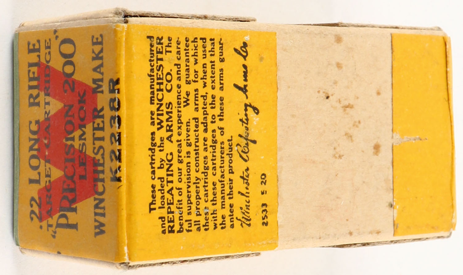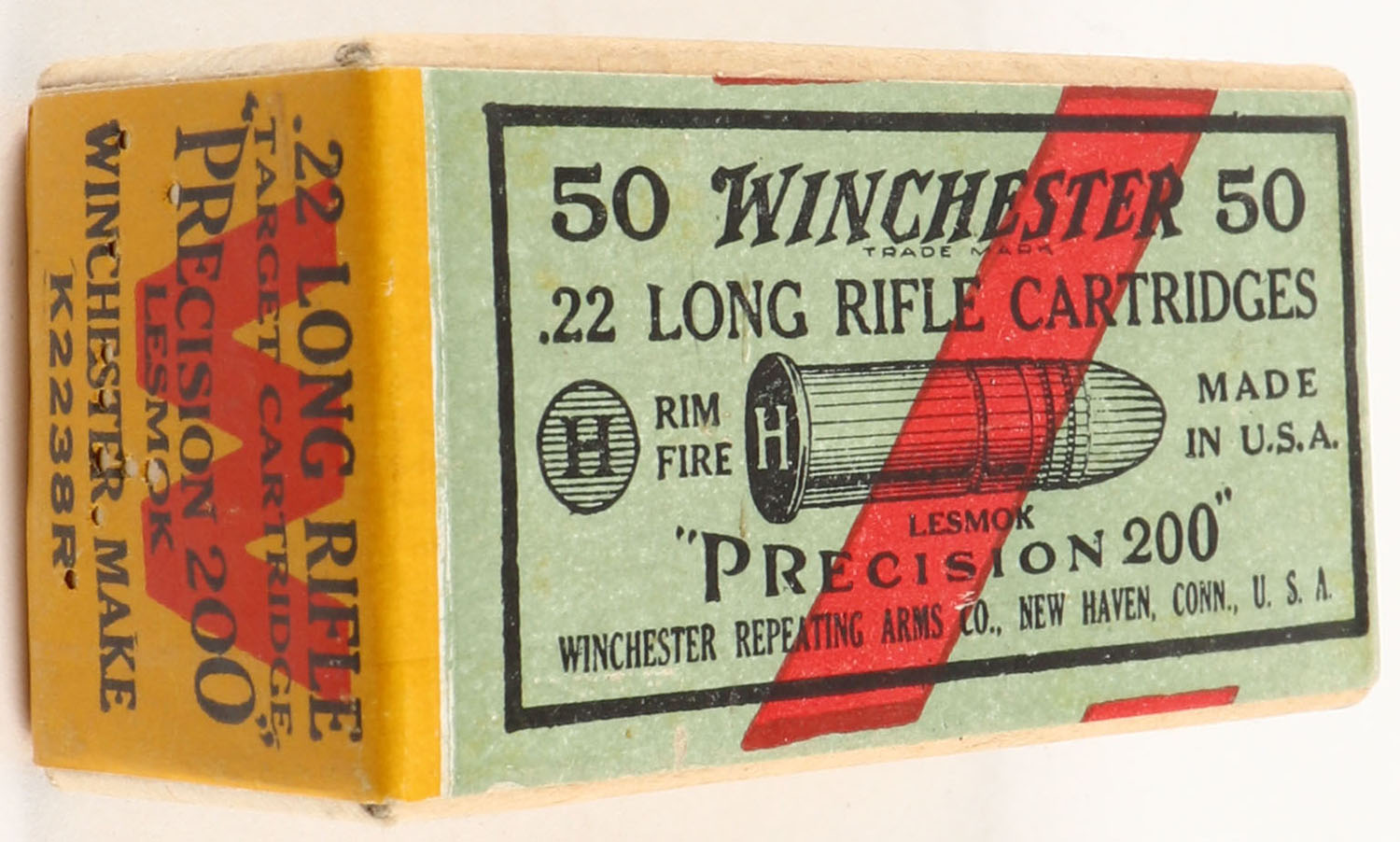 Winchester, ''Precision 200'', .22 Long Rifle, RR: WRA-129 LR-43b, FULL & SEALED, 2pc. Buff box with green red & white wraparound label, box is near mint with minty color, only very minor shelf wear, corners are sharp, edges are crisp, label is intact. Grade: Excellent ++ - Value: 80 to 240
