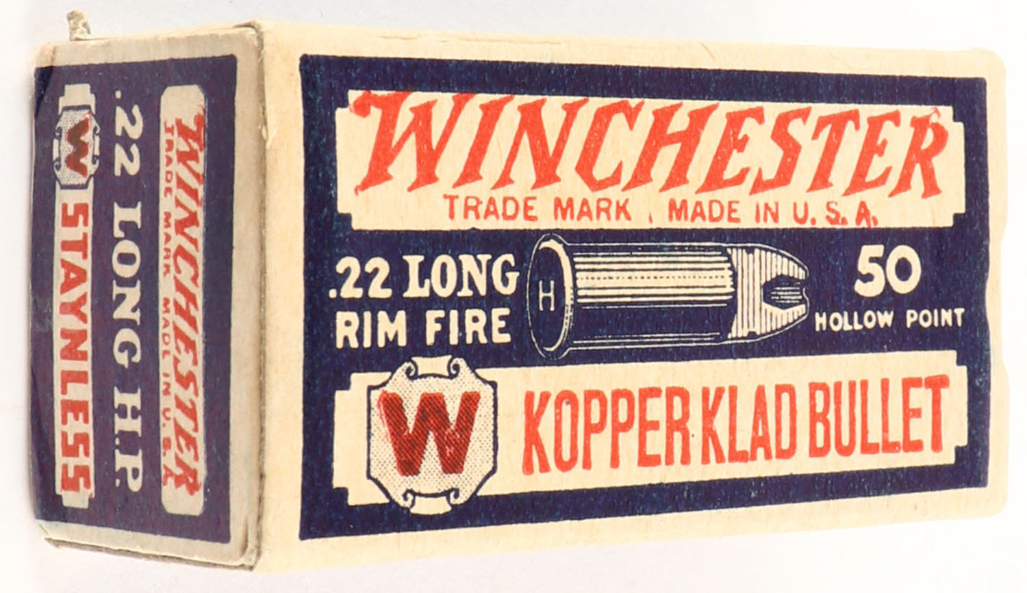 Winchester, Kopper Klad Bullet, .22 Long Hollow Point, RHWeb: WRA-12.5 L-2a, Full, 1pc. Blue white & red box, box is solid with excellent color, very minor age soiling, corners are mostly sharp, edges are crisp, end flaps are solid, ammo is excellent. Grade: Excellent + - Value: 300 to 900