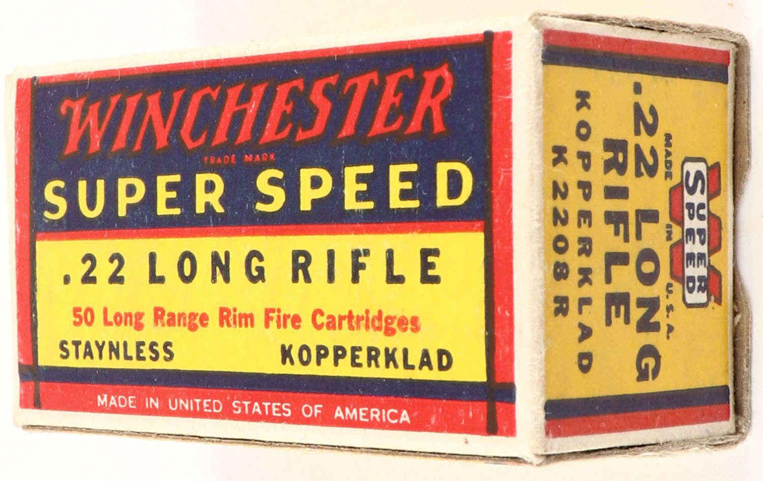 Winchester, Super Speed, .22 Long Rifle, Staynless Kopperklad, RHWeb: WRA-16 LR-1b, Full, 1pc. Yellow blue & red box, box is solid with excellent color, very minor shelf wear, corners are mostly sharp, edges are crisp, end flaps are solid, ammo is excellent. Grade: Excellent + - Value: 10 to 50