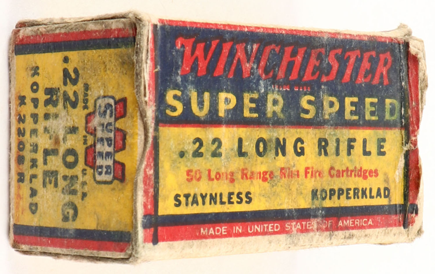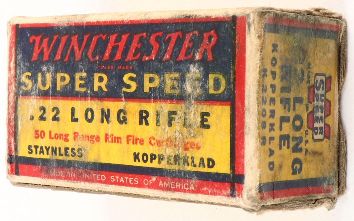 Winchester, Super Speed, .22 Long Rifle, Staynless Kopperklad, RHWeb: WRA-16 LR-1b, Full, 1pc. Yellow blue & red box, box is solid with fir to good color, age soiling, shelf wear, front has been written on, edge & corner wear, end flaps are solid, ammo is excellent. Grade: Good - Value: 4 to 20