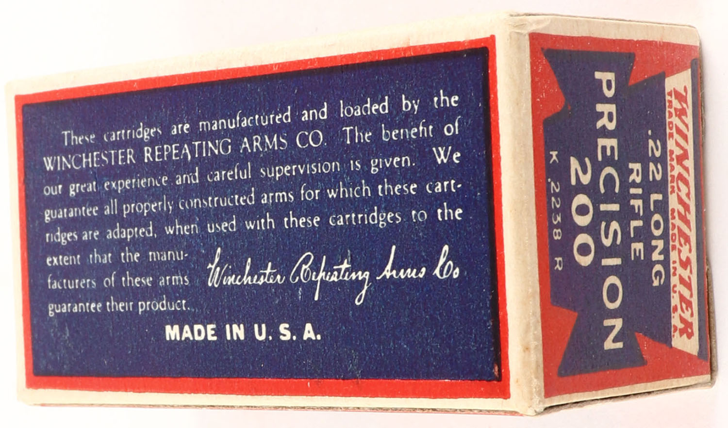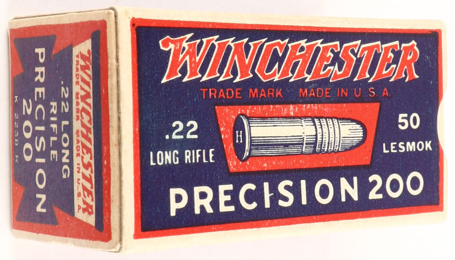 Winchester, Precision 200, .22 Long Rifle, RHWeb: WRA-53 LR-11f, Full, 1pc. Blue red & white box, box is MINT with minty color, corners are sharp, edges are crisp, end flaps are solid, ammo is excellent. Grade: MINT - Value: 80 to 320