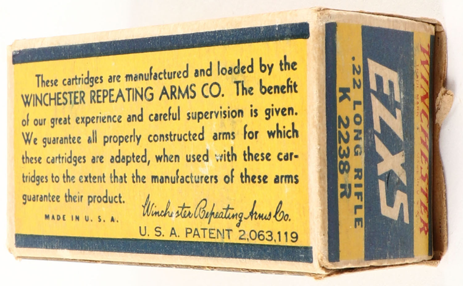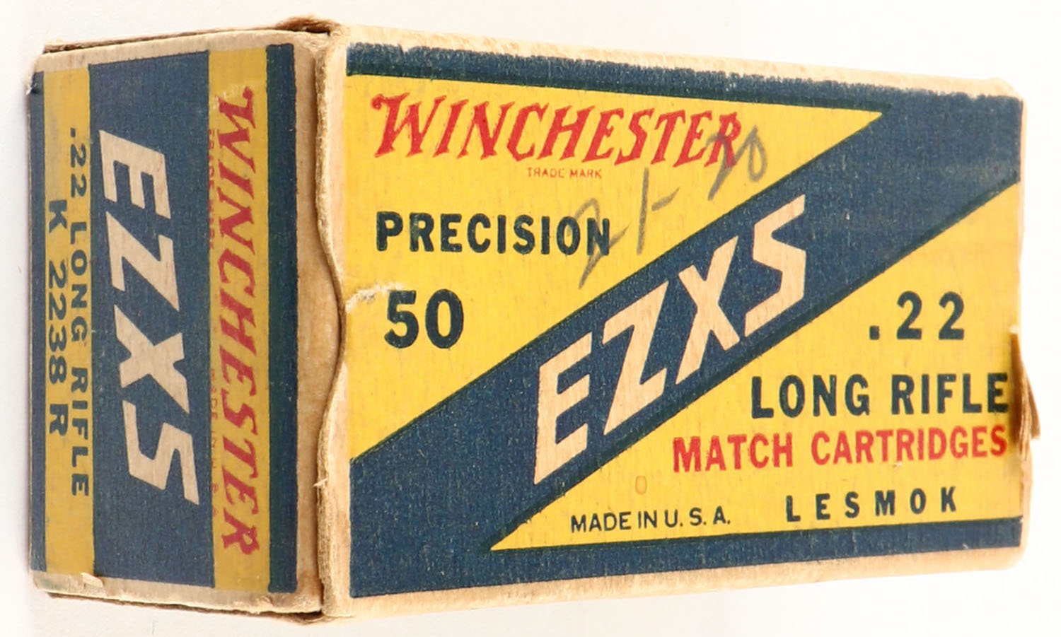 Winchester, EZXS, .22 Long Rifle, Match Cartridges, RHWeb: WRA-54 LR-3b, Partial 49rds., 1pc. Yellow & blue box, box is solid with very good color, minor age soiling, top has been written on, minor corner wear, edges are mostly crisp, end flaps are solid, ammo is excellent. Grade: Very Good ++ - Value: 10 to 50