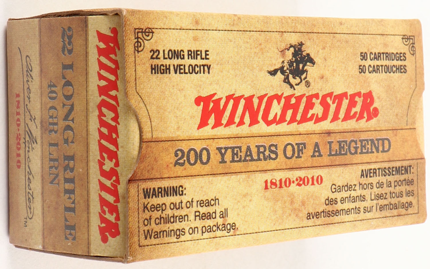 Winchester, .22 Long Rifle, 200 Year Commemorative Box (1810-2010), RHWeb: WRA-H&R-72 LR-10, Full, 1pc. Brown & red box, box is MINT with minty color, sharp corners, crisp edges, solid end flaps, ammo is mint. Grade: MINT - Value: 10 to 50