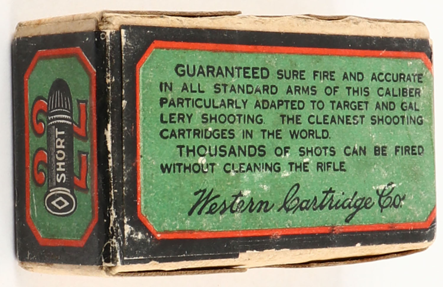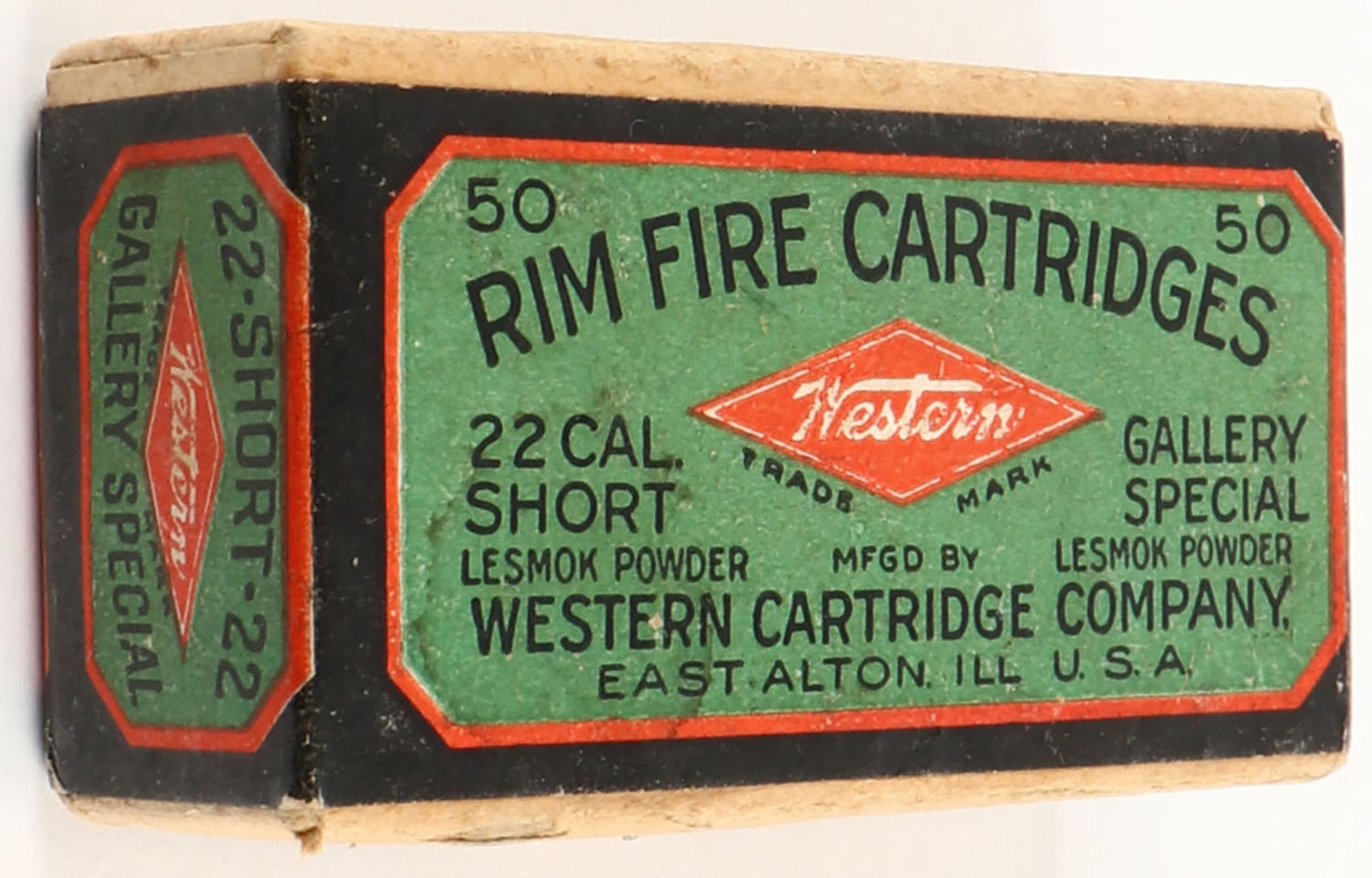 Western, Rim Fire Cartridges, .22 Short, Gallery Special, Lesmok Powder, RHWeb: WCC-48 S-5, FULL & SEALED, 2pc. Buff box with green blue & red wraparound label, box is solid with excellent color, very minor age soiling & corner wear, edges are mostly crisp, label is intact. Grade: Excellent + - Value: 50 to 150