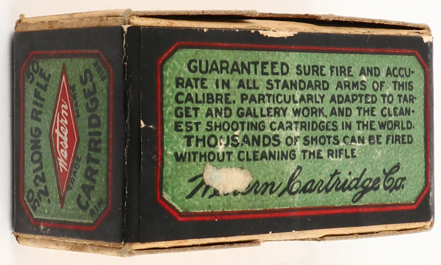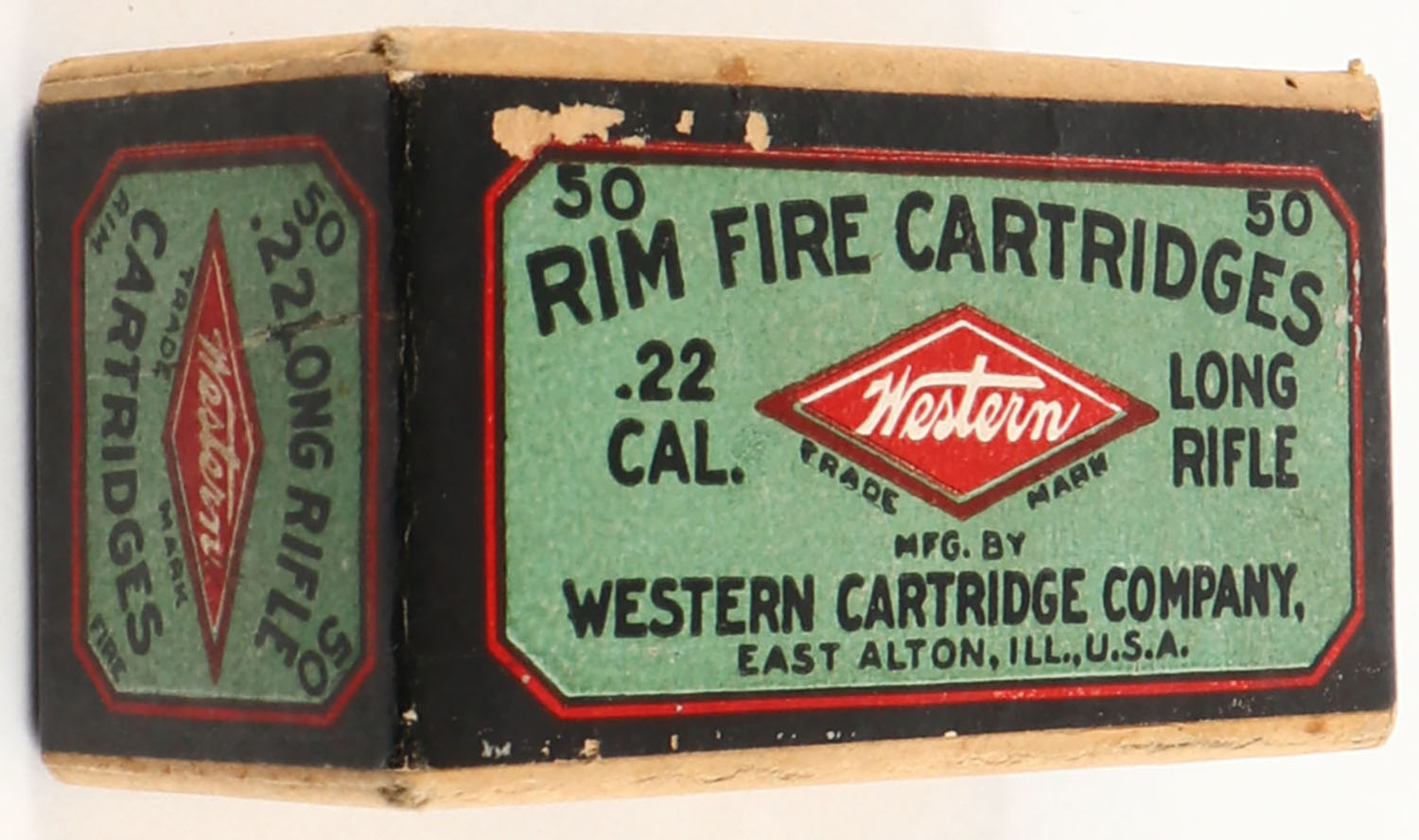 Western, Rim Fire Cartridges, .22 Long Rifle, RHWeb: WCC-3 LR-1, FULL & SEALED, 2pc. Buff box with green blue & red wraparound label, box is solid with excellent color, very minor shelf & corner wear, edges are mostly crisp, label is intact. Grade: Excellent + - Value: 40 to 120