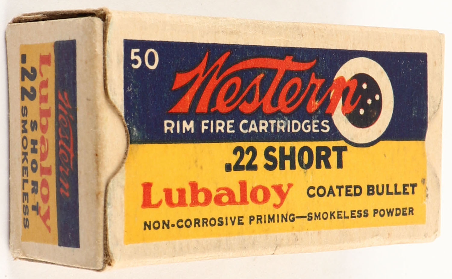 Western, Rim Fire Cartridges, .22 Short, Lubaloy Coated Bullet, WCC-4.4 S-1b, Full, 1pc. Yellow blue & red bulls eye box, box is solid with excellent color, very minor age soiling & corner wear, edges are mostly crisp, end flaps are solid, ammo is excellent to minty. Grade: Excellent + - Value: 16 to 60