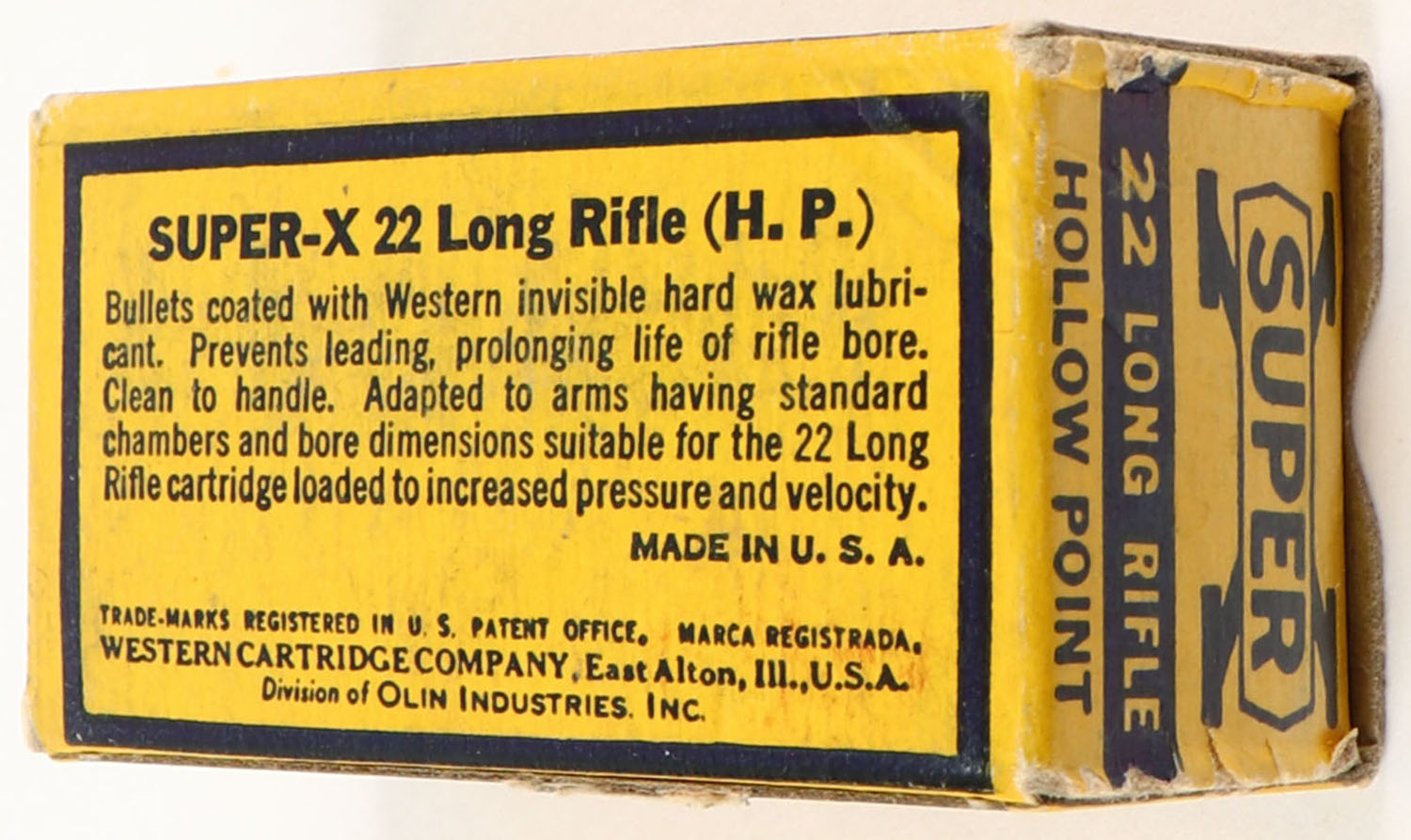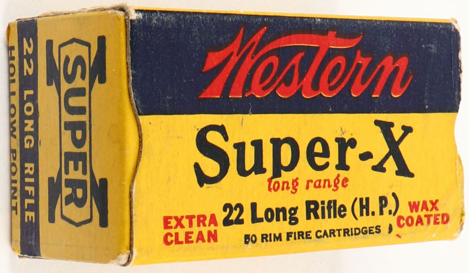 Western, Super-X, .22 Long Rifle Hollow Point, Extra Clean Wax Coated, RHWeb: Super-X-Long Rifle WCC-34 LRHP-27, Full, 1pc. Yellow blue & red box, box is solid with excellent color, very minor age soiling, some corner wear, edges are mostly crisp, end flaps are solid, ammo is minty. Grade: Excellent - Value: 8 to 40