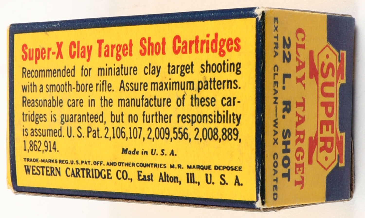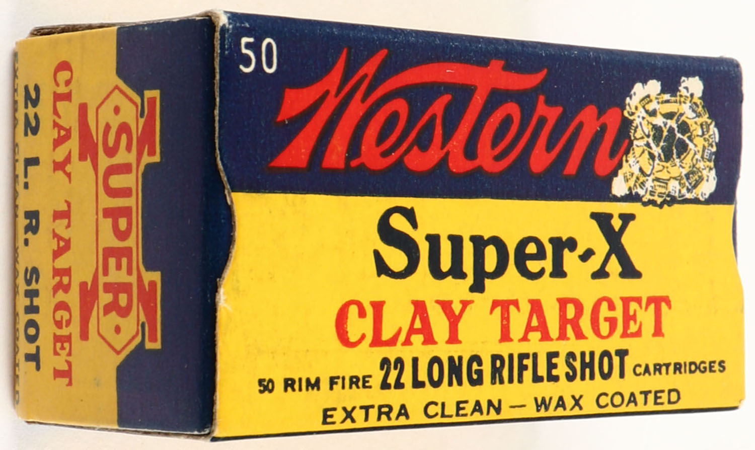 Western, Super-X, .22 Long Rifle Shot, Extra Clean Wax Coated, RHWeb: Super-X Long Rifle WCC-44 LRS-10, Full, 1pc. Yellow blue & red box, box is solid with excellent to minty color, corners are sharp, edges are crisp, end flaps are solid, ammo is excellent. Grade: Excellent + - Value: 10 to 50