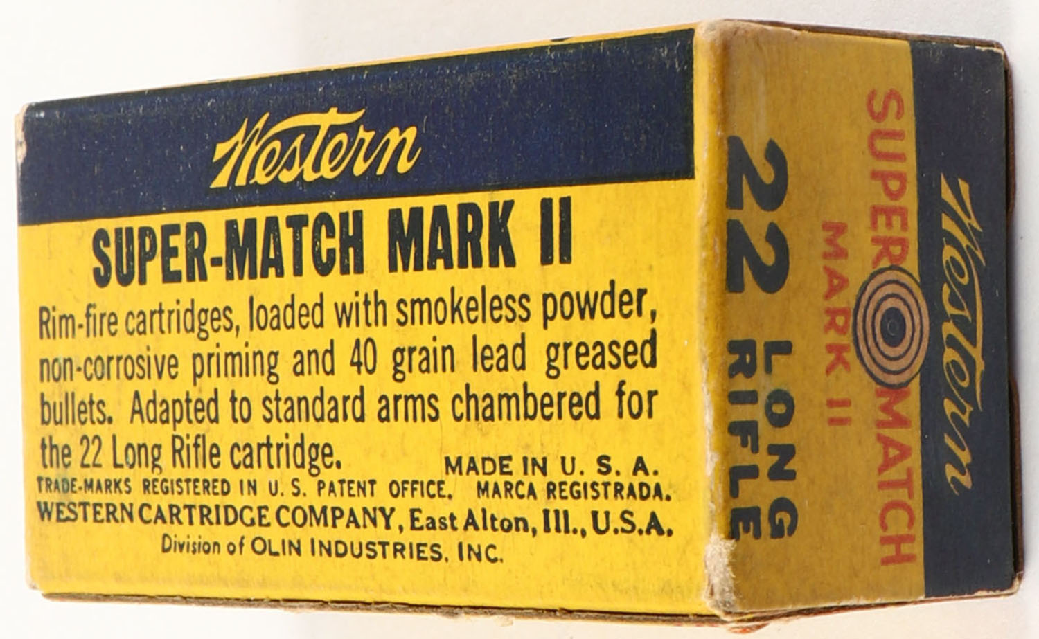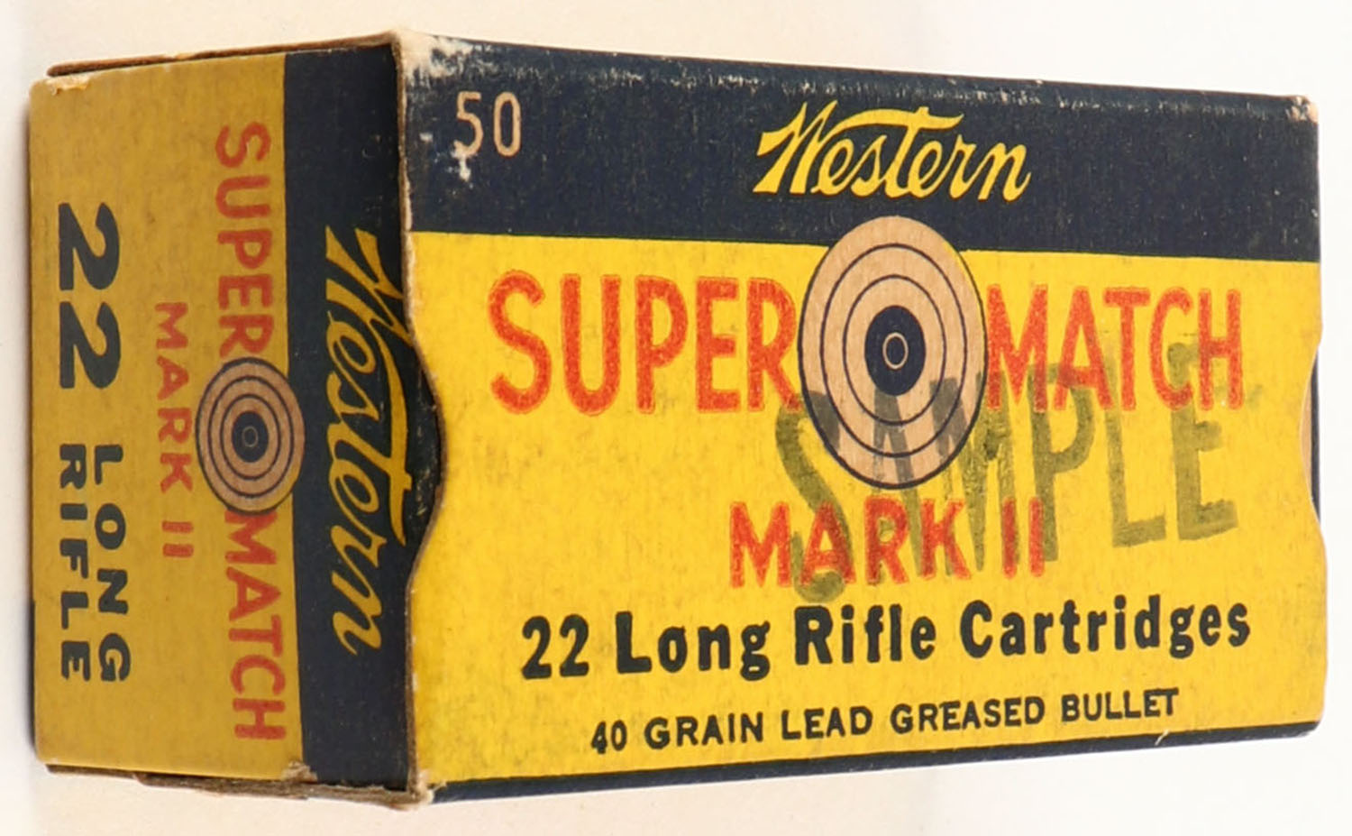 Western, Super Match Mark II, .22 Long Rifle, SAMPLE, RHWeb: WCC-51.2 LR-3.5 Full, 1pc. Yellow blue & red box with black ''Sample'' over-stamp, box is solid with very good to excellent color, minor age soiling, some corner wear, edges are mostly crisp, end flaps are solid, ammo is excellent. Grade: Excellent - Value: 10 to 50
