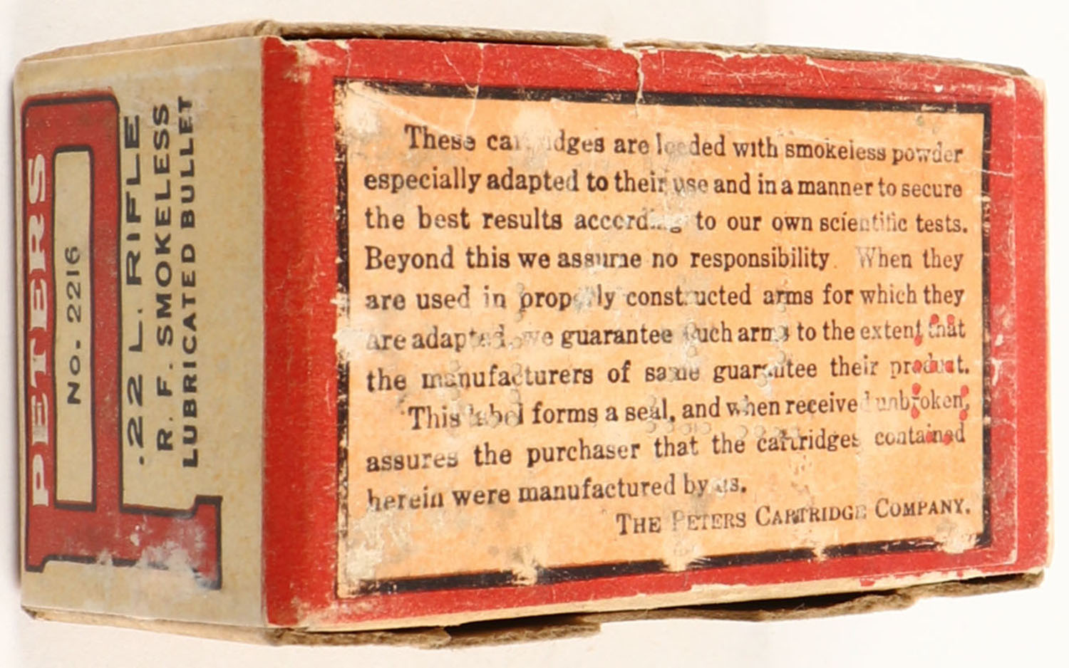 Peters, Smokeless R.F. Rifle Cartridges, .22 Long Rifle, Lubricated Bullet, RHWeb: PCC-5A LR-6, FULL & SEALED, 2pc. Buff box with orange & red wraparound label, box is solid with excellent color, very minor corner wear, edges are crisp, label is intact. Grade: Excellent + - Value: 30 to 120