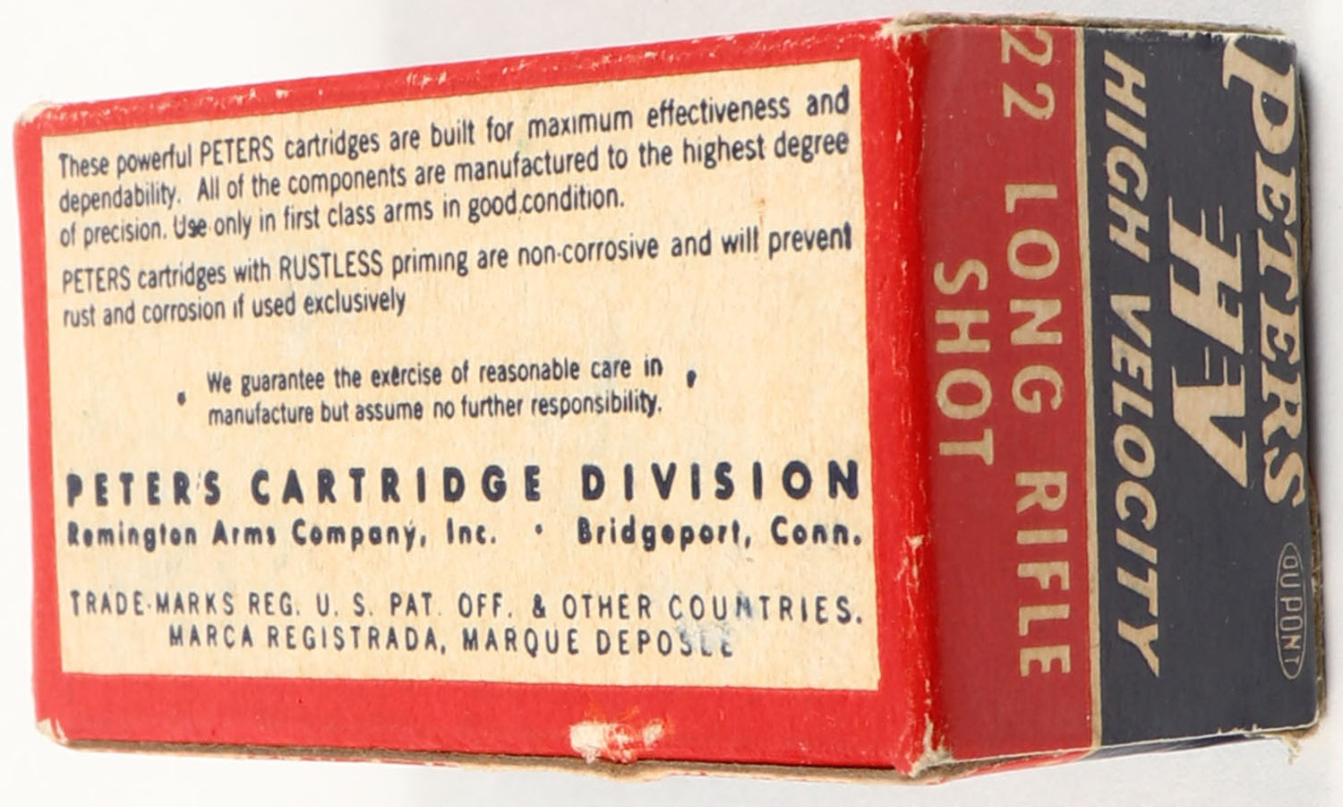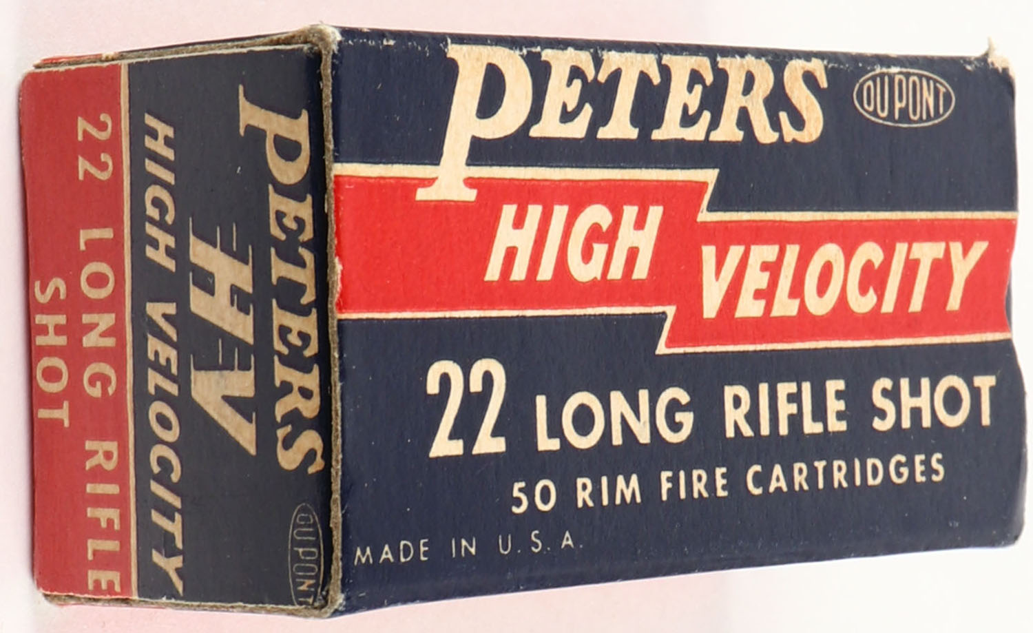 Peters, High Velocity, .22 Long Rifle Shot, RHWeb: PCC-17 LR-4c, Full, 1pc. Blue red & white box, box is solid with excellent color, minor corner wear, edges are mostly crisp, end flaps are solid, ammo is excellent. Grade: Excellent + - Value: 10 to 50
