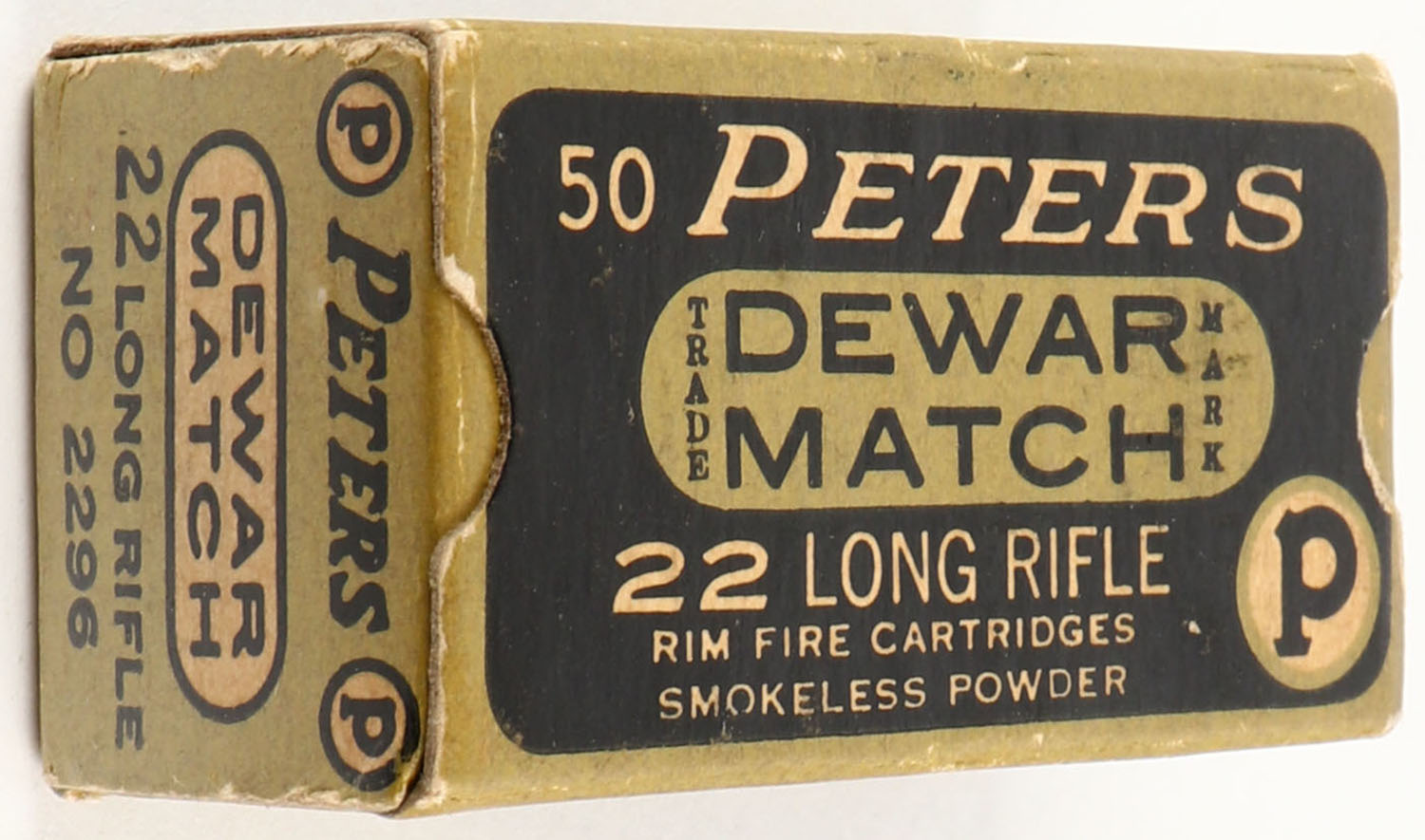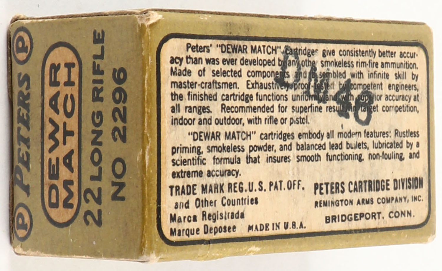Peters, Dewar Match, .22 Long Rifle, RHWeb: PCC-53B LR-2c, Full, 1pc. Black & gold box, box is solid with excellent color, minor age soiling, very minor corner wear, edges are mostly crisp, end flaps are solid, ammo is excellent. Grade: Excellent - Value: 10 to 50