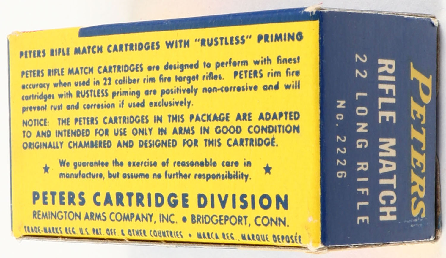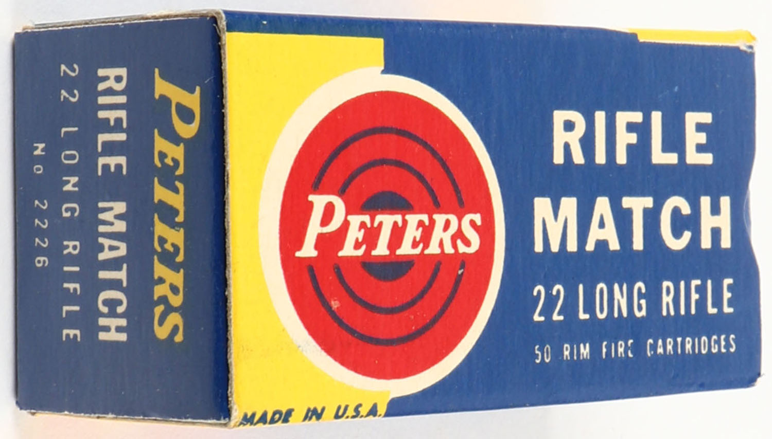 Peters, Rifle Match, .22 Long Rifle, RHWeb: PCC-55 LR-4.5, Full, 1pc. Blue yellow & red box, box is near mint with minty color, only very minor corner wear, edges are crisp, end flaps are solid, ammo is excellent. Grade: Excellent ++ - Value: 20 to 60