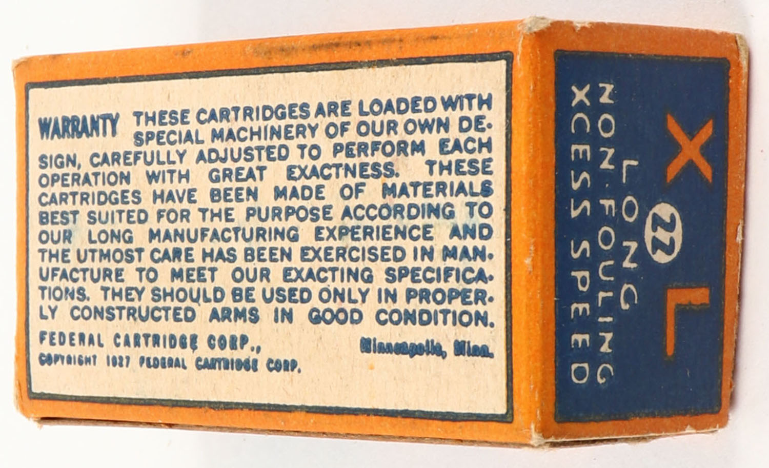 Federal, XL Cartridges, .22 Long, Xcess Speed, RHWeb: FCC-4.1 L-1b, Full, 1pc. Blue orange & white box, box is solid with excellent color, minor age soiling & corner wear, edges are crisp, end flaps are solid, ammo is excellent to minty. Grade: Excellent + - Value: 300 to 600