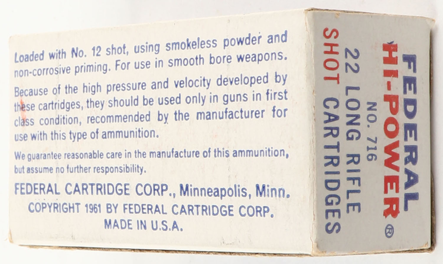 Federal, Hi-Power, .22 Long Rifle Shot, RHWeb: FED-8 LR-5a, Full, 1pc. White blue & red box, box is solid with excellent color, very minor age soiling & corner wear, edges are crisp, end flaps are solid, ammo is excellent. Grade: Excellent + - Value: 20 to 60