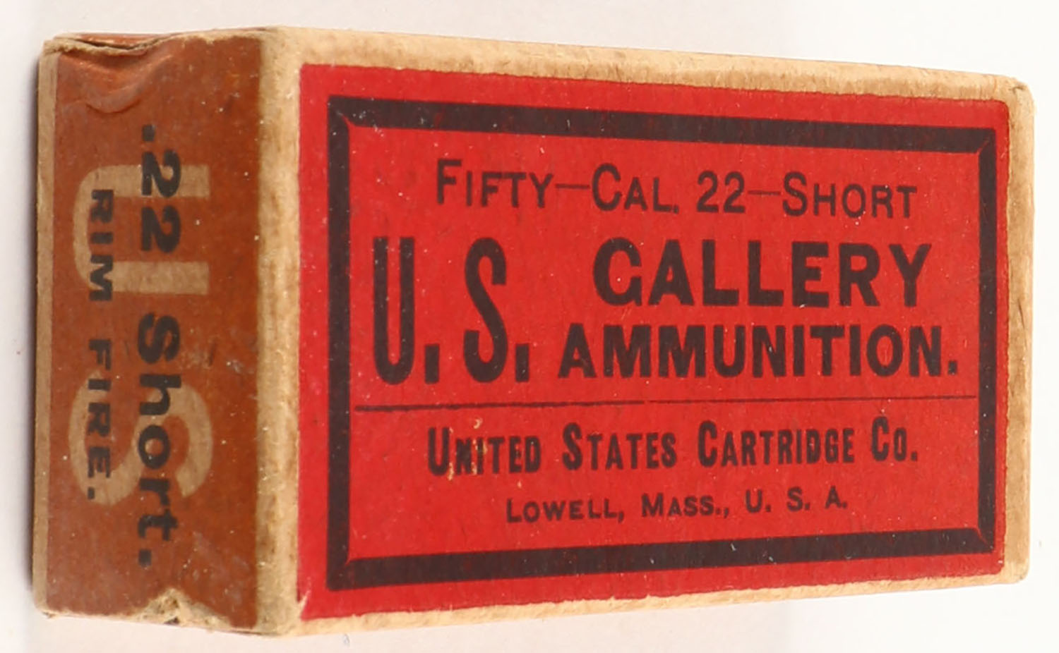 U.S., Gallery Ammunition, .22 Short, Target Cartridges, RHWeb: US-50A S-1c, Full, 1pc. Red orange & black box, box is solid with excellent color, very minor age soiling & corner wear, edges are mostly crisp, end flaps are solid, ammo is good to very good. Grade: Excellent - Value: 40 to 120