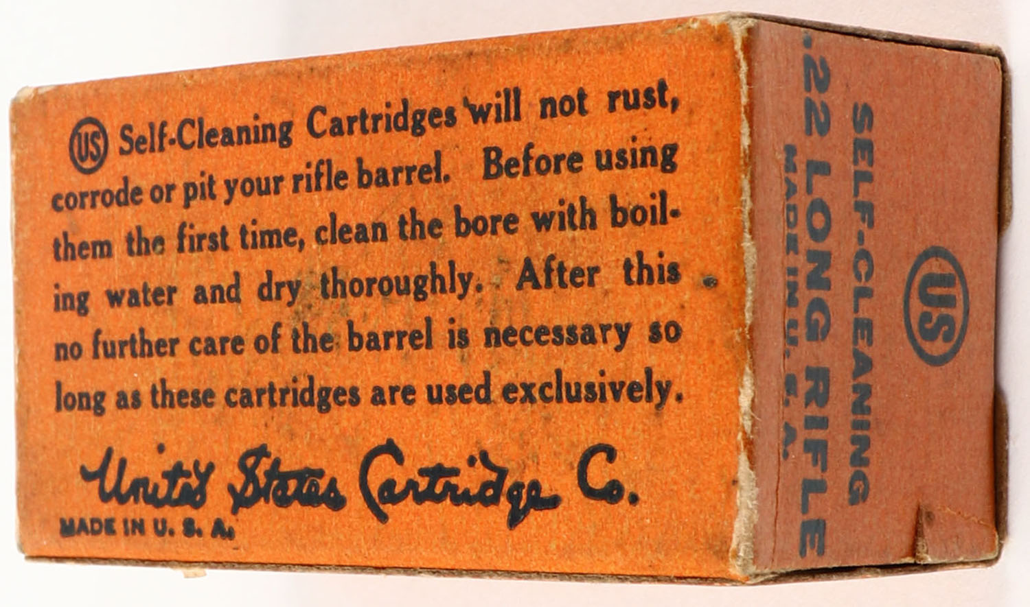 U.S., Self-Cleaning, .22 Long Rifle, RHWeb: US-10A LR-1c, Full, 1pc. Orange & blue box, box is solid with good to very good color, some age soiling & color fading, minor corner wear, very minor edge wear, end flaps are solid, ammo is very good. Grade: Very Good + - Value: 16 to 60