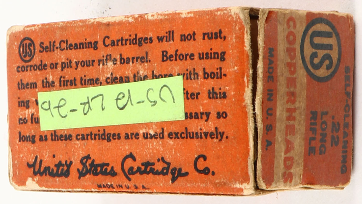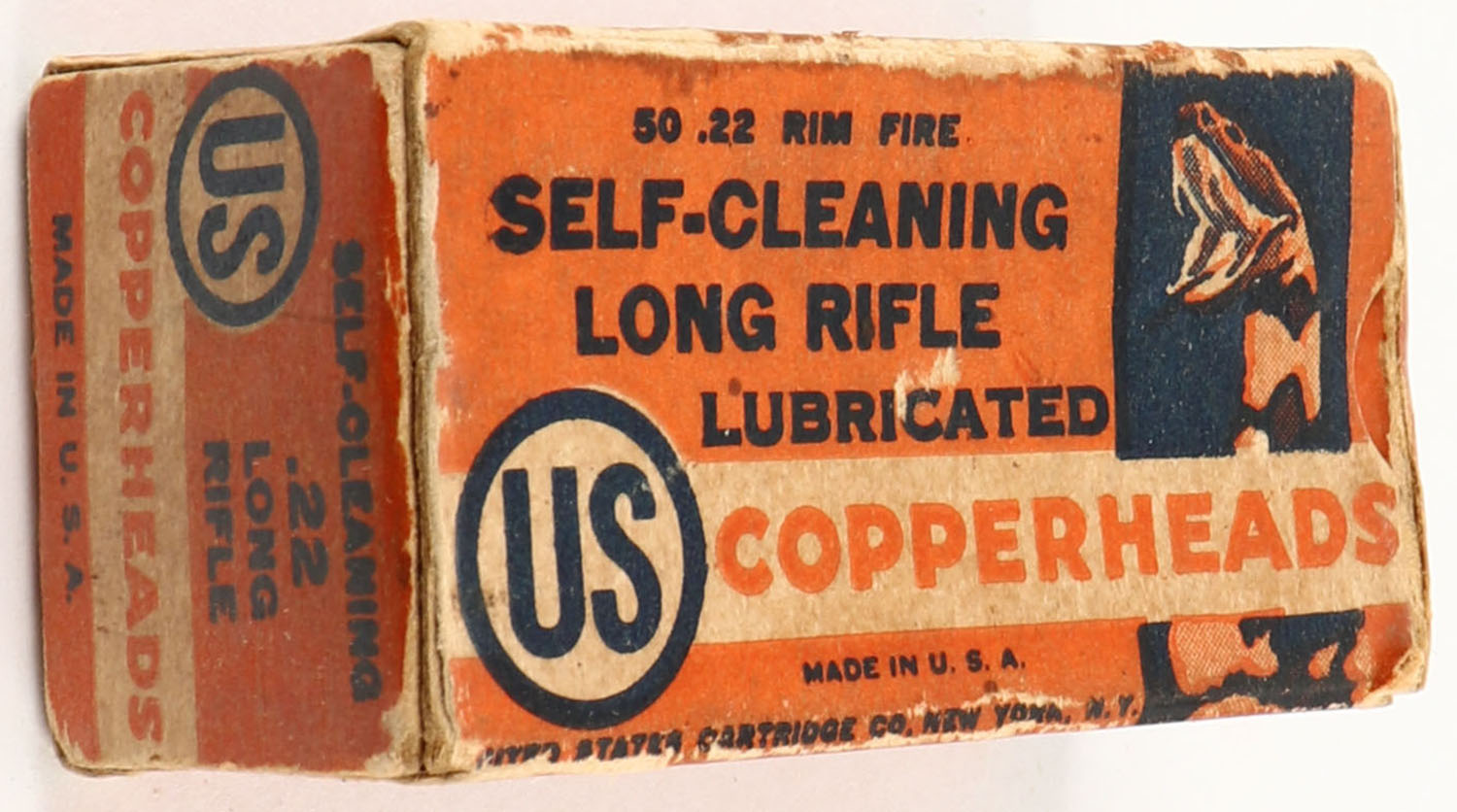 U.S., Copperheads, .22 Long Rifle, Self-Cleaning Lubricated, RHWeb: US-12 LR-2b, Full, 1pc. Orange white & blue box, right end flap is torn, very good color, some age soiling, edge & corner wear, left end flap is solid, ammo is good to very good. Grade: Good ++ - Value: 8 to 40
