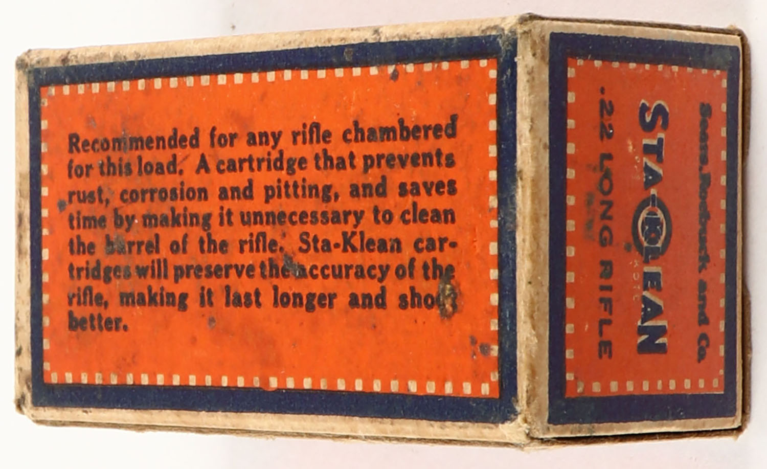 Sears, Sta-Klean, .22 Long Rifle, Kopper Kote, RHWeb: SEARS-3 LR-1a, Full, 1pc. Orange blue & buff box, box is solid with excellent color, minor age soiling, very minor corner wear, edges are mostly crisp, end flaps are solid, ammo is excellent. Grade: Excellent - Value: 100 to 400