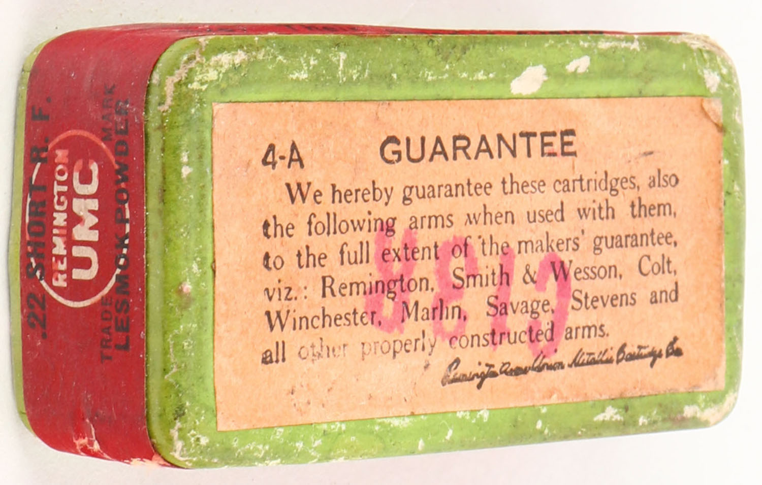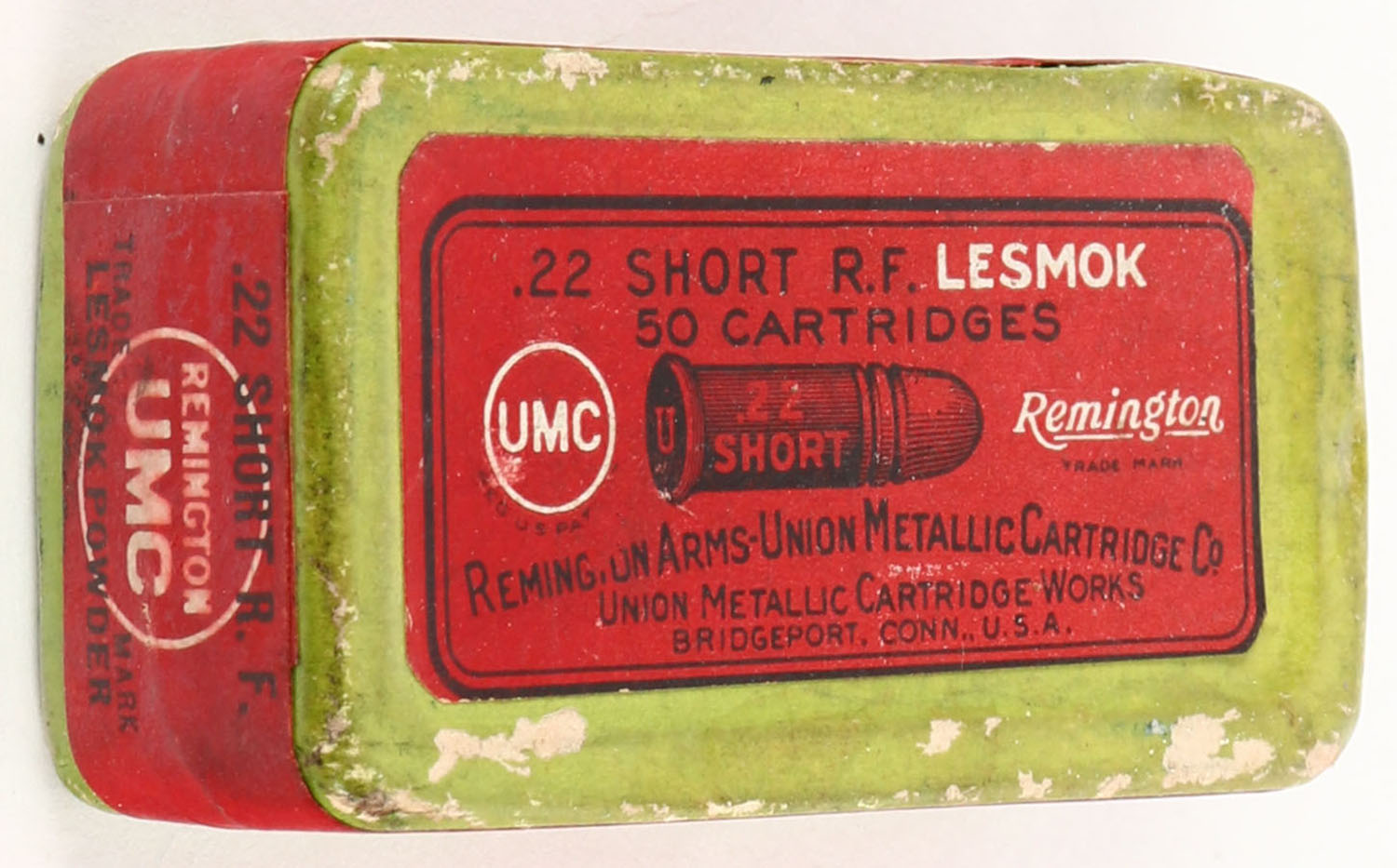 REM-UMC, R.F. Lesmok, .22 Short, RHWeb: REM-1 S-2A, Full, 1pc. Green box with red top & side sealing labels, box is solid with excellent color, very minor age soiling, some edge & corner wear, edges are crisp, labels are intact. Grade: Excellent - Value: 50 to 150