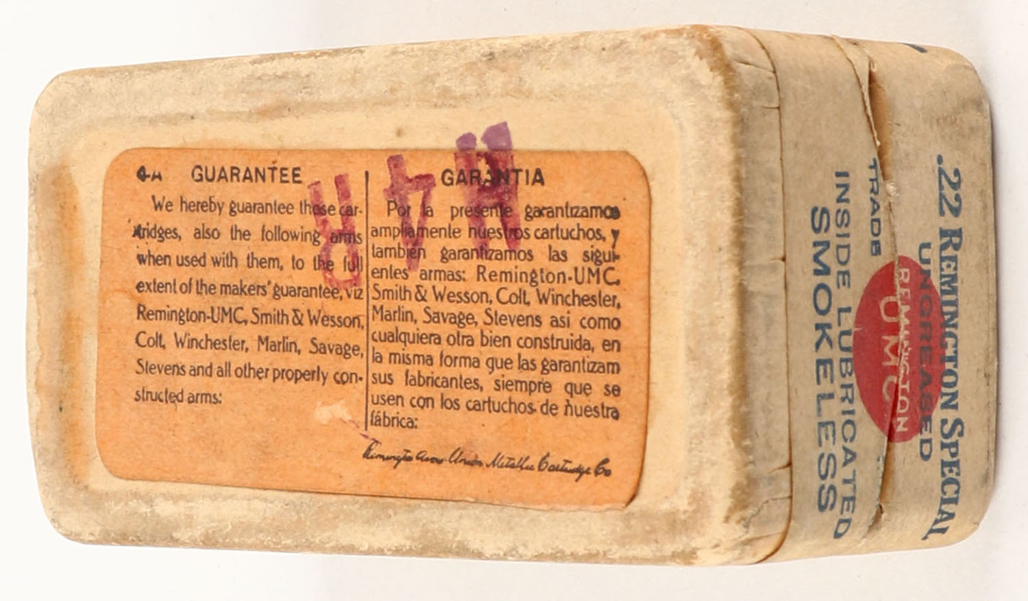 REM-UMC, Rim Fire Cartridges, .22 Remington Special, Smokeless Ungreased, RHWeb: REM-2 RS-2B, FULL & SEALED, 2pc. Buff box with buff top & side sealing labels, box is solid with very good to excellent color, some age soiling, very minor edge & corner wear, labels are intact. Grade: Excellent - Value: 100 to 300
