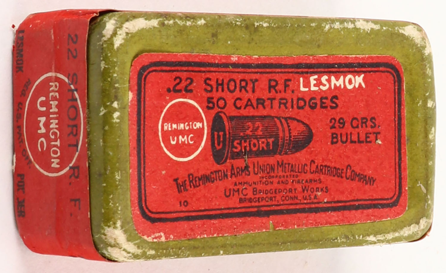 REM-UMC, R.F. Lesmok Cartridges, .22 Short, RHWeb: REM-3 S-2B, FULL & SEALED, 2pc. Green box with red top & side sealing labels, box is solid with excellent color, very minor age soiling, some edge & corner wear, labels are intact. Grade: Very Good ++ - Value: 50 to 150