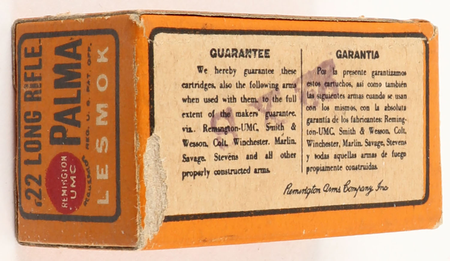 REM-UMC, Palma, .22 Long Rifle, Lesmok, RHWeb: REM-52 LR-1b, Full, 1pc. Orange black & red box, box is solid with excellent color, very minor corner wear, edges are crisp, end flaps are solid, ammo is good. Grade: Excellent ++ - Value: 40 to 120