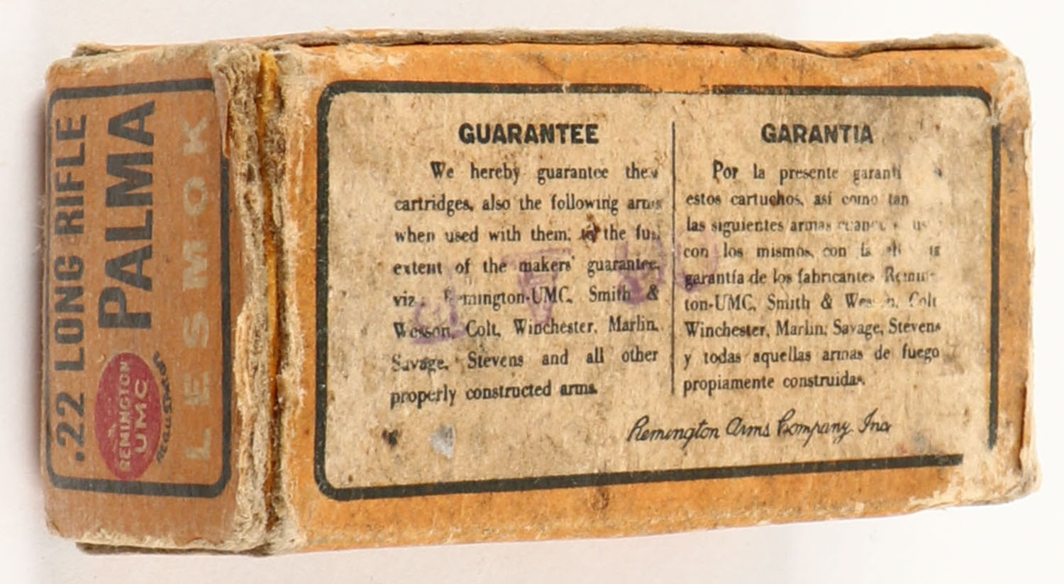 REM-UMC, Palma, .22 Long Rifle, Lesmok, RHWeb: REM-52 LR-1b, Partial 48rds., 1pc. Orange black & red box, box is solid with fair color, age soiling, color fading, stain on top, edge & corner wear, right end flap has been torn & repaired, ammo is good. Grade: Good - Value: 6 to 30